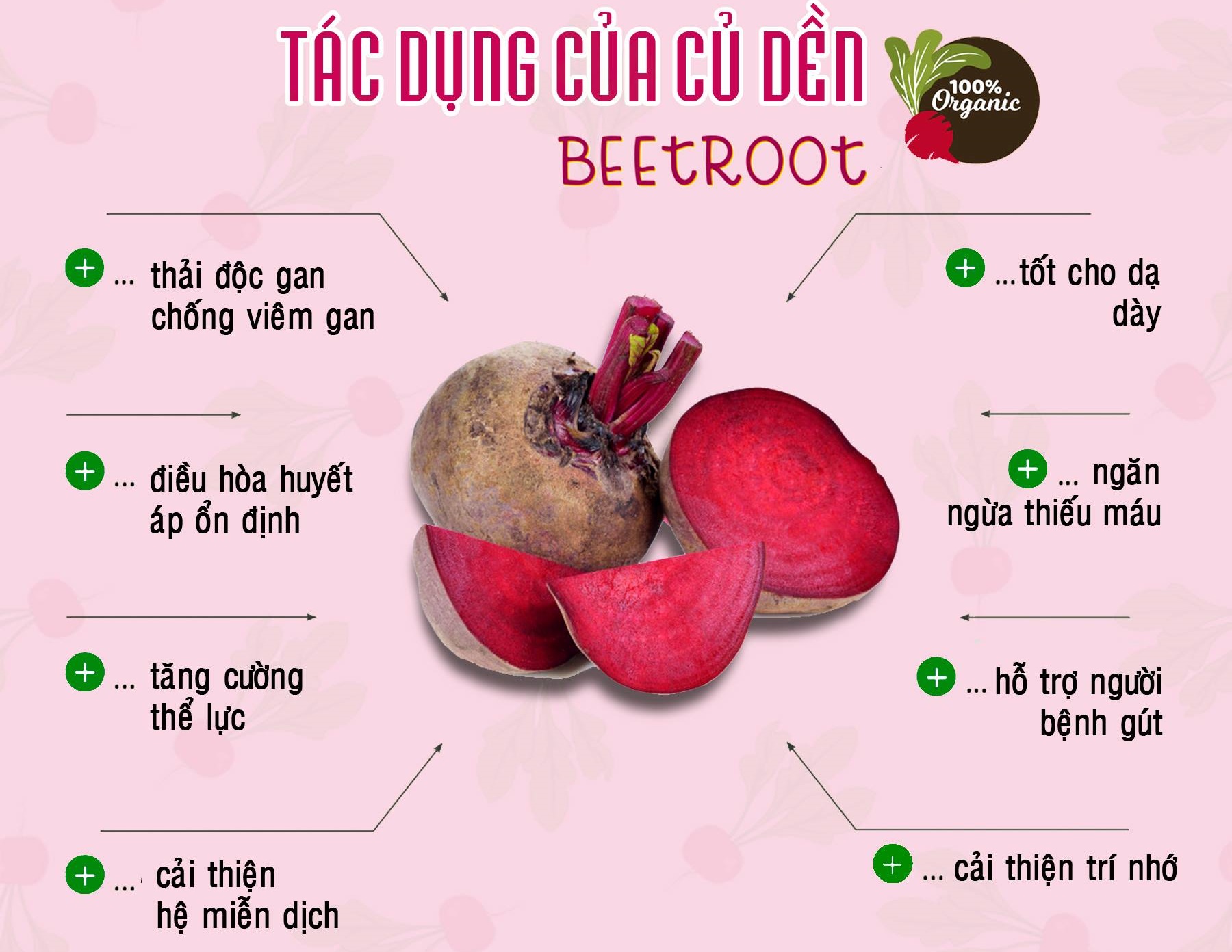 - Bột củ dền còn là thực phẩm bổ dưỡng cho người cao tuổi, có tác dụng trong việc bảo vệ sức khỏe như thanh lọc cơ thể, bảo vệ gan, ngăn ngừa bệnh ung thư, chống thiếu máu, cân bằng huyết áp, chữa bệnh gout, có tác dụng trong hỗ_trợ_điều_trị xơ vữa động mạch. Các vitamin và các chất dinh dưỡng trong củ dền giúp tăng cường hệ miễn dịch và chống nhiễm trùng, giúp kích thích sự oxy hóa của các tế bào, sản sinh ra những tế bào máu mới.