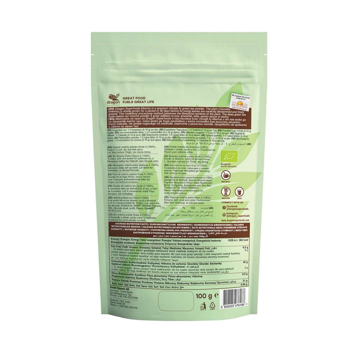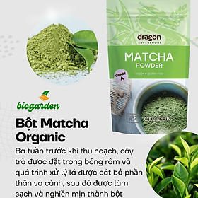 Bột Matcha hữu cơ Dragon Superfoods là bột trà xanh cao cấp (Hạng A). Ba tuần trước khi thu hoạch, cây được đặt trong bóng râm và trong quá trình xử lý lá được cắt bỏ phần thân và cành, sau đó được làm sạch cẩn thận và nghiền mịn thành bột. Phương pháp chế biến truyền thống này giữ được các chất dinh dưỡng có lợi của lá cây. Vị trà xanh đậm làm cho bột matcha trở thành một bổ sung tuyệt vời cho món sinh tố, đồ pha cà phê, nước sốt mặn hoặc bánh ngọt của bạn.