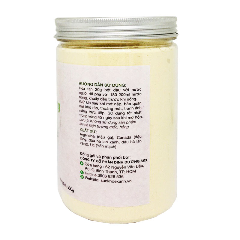 Ngũ cốc dinh dưỡng SKX gồm 5 loại bột đậu và ngũ cốc nguyên chất 100% nhập khẩu từ nước ngoài, đã được rang chín: đậu gà, đậu lăng đỏ, đậu hà lan vàng, đậu hà lan xanh, yến mạch. Sản phẩm đặc biệt hoàn toàn không sử dụng hương liệu, chất tạo màu, chất bảo quản. Ngũ cốc cung cấp đầy đủ các chất dinh dưỡng như đạm, sắt, chất béo, khoáng chất và vitamin rất tốt cho những  người bị gout, bị viêm khớp, hỗ trợ phòng ngừa sự phát triển của nhiều bệnh mãn tính như tiểu đường, tim mạch, béo phì, táo bón, huyết áp cao, ung thư vú, thiếu máu; tăng cường sức khỏe hệ thần kinh, tốt cho phụ nữ có thai và củng cố hệ miễn dịch. Ngoài ra ngũ cốc dinh dưỡng còn là nguồn thực phẩm cung cấp năng lượng cho cơ thể mà không gây tăng cân hay béo phì cho người sử dụng. Thành phần: đậu gà, đậu lăng đỏ, đậu hà lan xanh, đậu hà lan vàng, yến mạch 100% nguyên chất Hàm lượng dinh dưỡng tham khảo trong 100g bột ngũ cốc dinh dưỡng SKX   Đậu gà Đậu gà có nhiều thành phần dinh dưỡng như protein, sắt, vitamin, chất bé Đặc biệt chúng chứa chất xơ và đạm nhiều hơn các loại đậu cùng họ hàng. Nhờ nguồn dinh dưỡng dồi dào, các nhà nghiên cứu bệnh lý cho rằng đậu gà không chỉ giúp tăng cường sức khỏe mà còn ngăn ngừa bệnh ung thư, tiểu đường, tim mạch… Hàm lượng chất xơ cao cùng lượng Kali, Vitamin C và B6 trong đậu gà giúp cân bằng Cholesterol trong máu, góp phần bảo vệ cho sức khỏe tim mạch và làm giảm huyết áp. Đậu gà có công dụng hỗ trợ tiêu hóa rất tốt, là một trong 20 loại thực phẩm chứa hàm lượng chất xơ cao, giúp ngăn ngừa táo bón và hỗ trợ nhuận trường, qua đó thúc đẩy hệ tiêu hóa hoạt động tốt hơn. Chất xơ cũng giúp cân bằng độ pH, làm tăng vi khuẩn có lợi, đồng thời chống sỏi thận, béo phì… Đậu gà chứa rất nhiều Sắt, Phốt pho, Canxi, Magiê, Mangan, Kẽm và Vitamin K. Tất cả các Vitamin và khoáng chất này đều góp phần xây dựng và bảo vệ cấu trúc xương chắc khỏe. Đậu lăng Đậu lăng là một trong những loại đậu được đề cao về giá trị dinh dưỡng với nhiều công dụng cực kì tốt cho sức khỏe con người. Chất xơ hòa tan có trong đậu lăng thúc đẩy hệ tiêu hóa và đường ruột hoạt động ổn định, ngăn ngừa táo bón và một số vấn đề khác như : viêm túi thừa, túi thừa đại tràng… Cung cấp nguồn protein dồi dào, có thể thay thế bữa cơm hằng ngày mà không lo bị tích tụ chất béo gây mỡ thừa, là sản phẩm hoàn toàn hợp lý cho người đang giảm cân. Giảm lượng cholesterol xấu trong máu, là thực phẩm có lợi đối với các bệnh nhân đang mắc tiểu đường, hạ huyết áp và tim mạch. Đây là sự lựa chọn đúng đắn nhất cho người thiếu sắt, bởi trong thành phần của đậu lăng chứa sắt giúp bổ sung nguồn năng lượng cần thiết cho cơ thể, đặc biệt là đối với độ tuổi dậy thì và phụ nữ đang mang thai. Đây cũng là một thực phẩm cực kì có lợi cho thai nhi từ trong bụng mẹ, bởi nó có chứa axit folic – một loại axit ngăn ngừa dị tật bẩm sinh ở thai nhi. Khoáng chất magne và folate có trong đậu lăng hỗ trợ quá trình trao đổi oxy cho cơ thể, ngăn ngừa chứng xơ vữa động mạch và các loại bệnh liên quan đến tim mạch. Đậu hà lan xanh Đậu hà lan rất bổ dưỡng và chứa nhiều carbohydrate phức - là nguồn cung cấp năng lượng bền vững cho cơ thể. Đậu hà lan xanh chứa hàm lượng chất chống ô xy hóa cao hỗ trợ bảo vệ hệ thống miễn dịch khỏi các bệnh mạn tính và saponin giúp làm giảm nguy cơ ung thư và ức chế sự phát triển của khối u. Ngoài ra, đậu hà lan xanh còn là một nguồn giàu vitamin K giúp giảm nguy cơ ung thư tuyến tiền liệt. Đậu hà lan xanh chứa các khoáng chất thiết yếu như kali và magiê giúp ngăn ngừa huyết áp cao. Đậu hà lan xanh chứa hàm lượng chất xơ cao giúp làm giảm cholesterol xấu, từ đó làm giảm nguy cơ mắc bệnh tim, ngăn chặn sự gia tăng lượng đường trong máu, hỗ trợ tốt cho người bệnh tiểu đường. Chất xơ và protein trong đậu hà lan giữ cho dạ dày no và giảm sự thèm ăn, do đó thúc đẩy giảm cân. Chất xơ còn có công dụng nuôi các vi khuẩn có ích trong ruột giúp cho hệ vi khuẩn có ích phát triển làm giảm nguy cơ phát triển các bệnh đường tiêu hóa như hội chứng ruột kích thích, hội chứng viêm ruột và ung thư ruột kết, ngăn ngừa táo bón. Đậu hà lan xanh chứa đầy vitamin A và lutein, sắc tố carotene. Lutein có tác dụng làm giảm nguy cơ mắc các bệnh về mắt do tuổi tác như thoái hóa điểm vàng và đục thủy tinh thể. Đậu hà lan xanh là nguồn vitamin C tuyệt vời, nên rất hiệu quả trong việc tăng cường hệ miễn dịch, thúc đẩy sản xuất collagen, giúp da săn chắc và sáng mịn, ngăn ngừa rụng tóc bằng cách giữ cho nang tóc chắc khỏe. Đậu hà lan vàng Đậu hà lan vàng gần tương tự với hà lan xanh nhưng có khác biệt chút về hàm lượng dinh dưỡng. Đậu hà lan vàng cũng rất bổ dưỡ