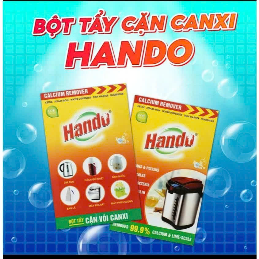 Thông tin sản phẩm Tên sản phẩm : Bột tẩy cặn nước đá vôi ấm đun, bình nước Hando Hướng dẫn sử dụng : Cho nước vào ấm và phích, đổ bột theo tỷ lệ