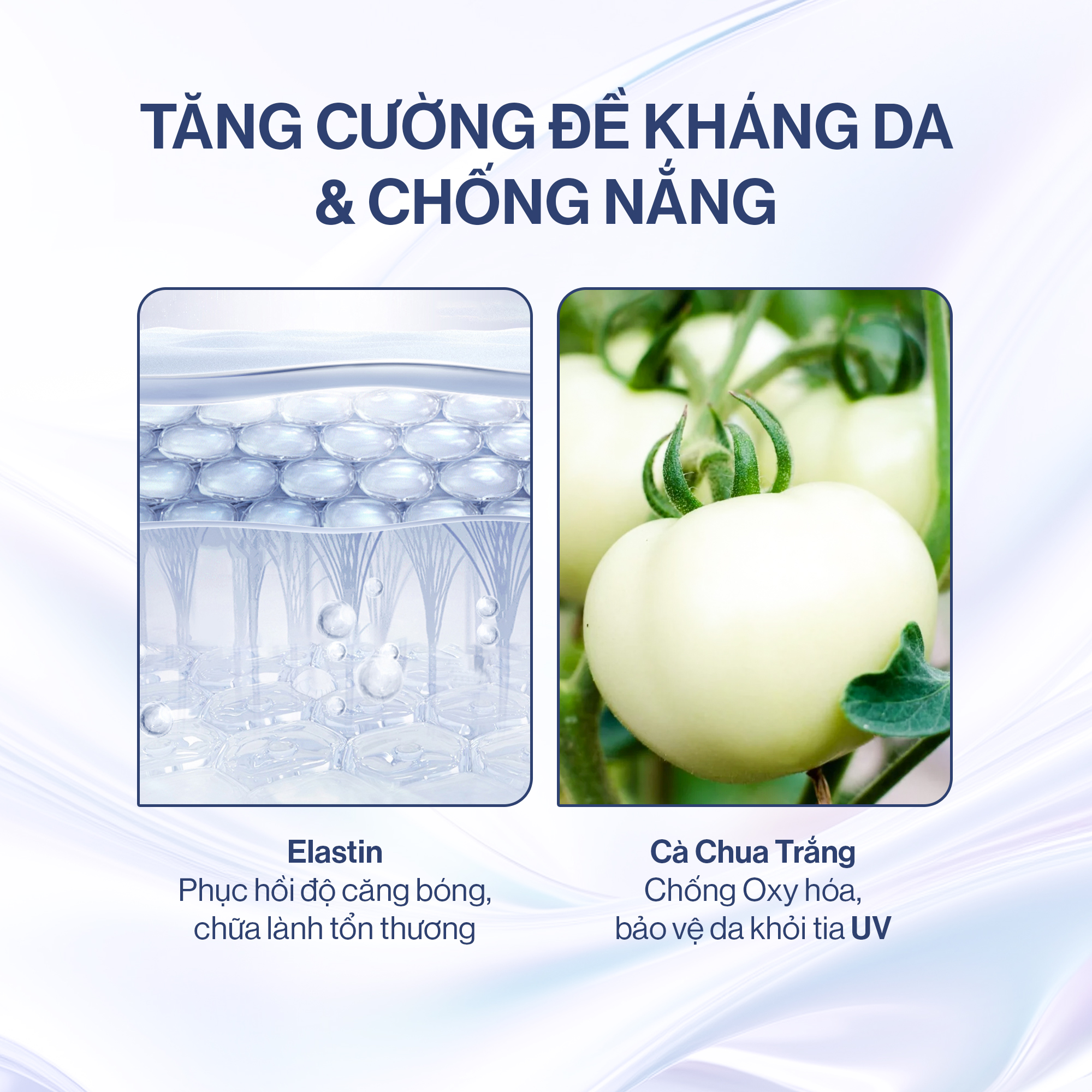 Thành phần: Mỗi viên nang cứng chứa: Glutathione: 200 mg N-acetylglucosamine: 100 mg L-Cystine: 50 mg Bột dầu hoa anh thảo (Oenothera biennis): 50 mg Vitamin C (acid L- ascorbic): 40 mg Chiết xuất lựu
