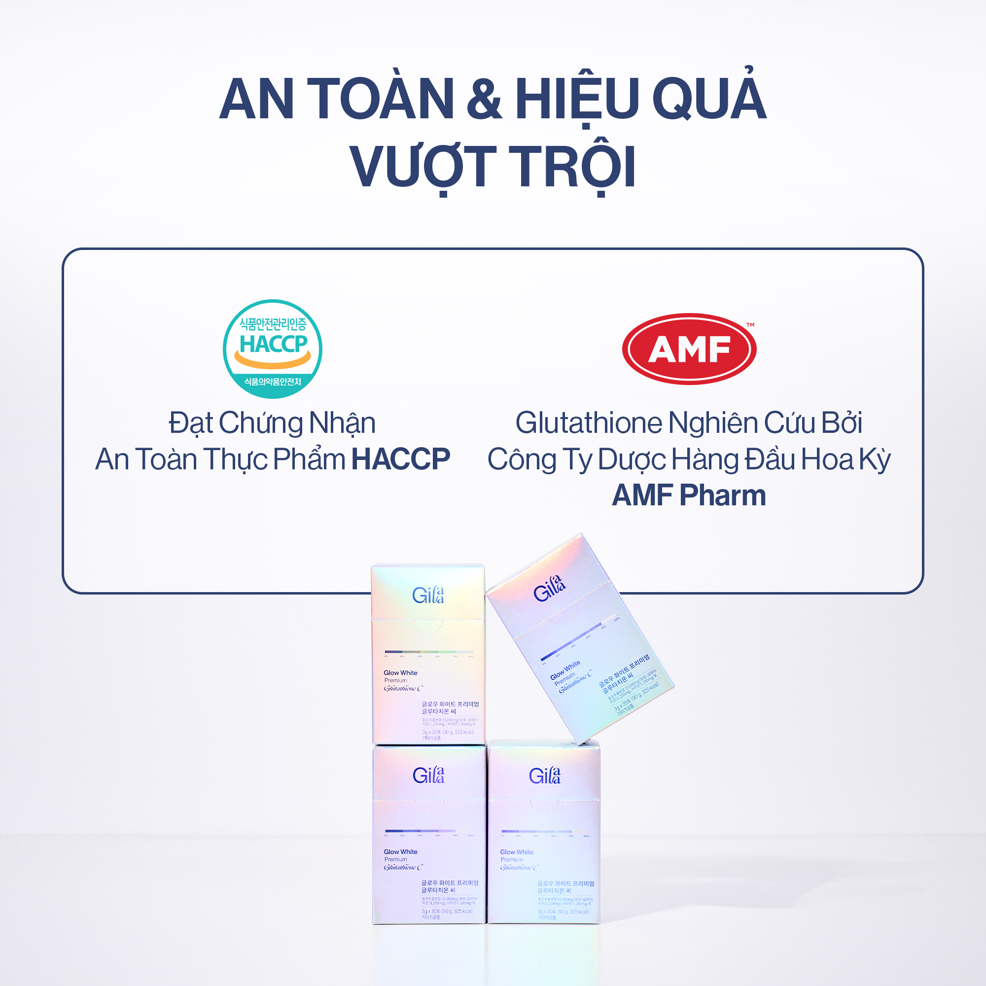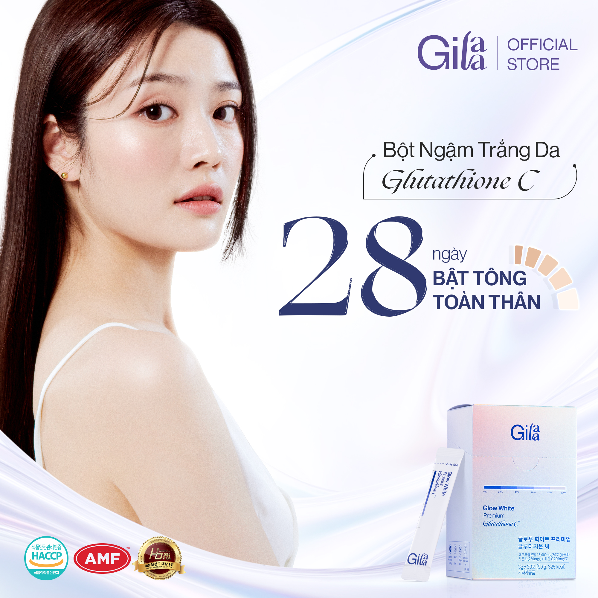 Bột ngậm trắng da Glutathione C Gilaa với công thức kết hợp các thành phần cao cấp Glutathione, Vitamin C, Elastin & Cà Chua Trắng giúp dưỡng trắng bật tông toàn thân hiệu quả nhanh