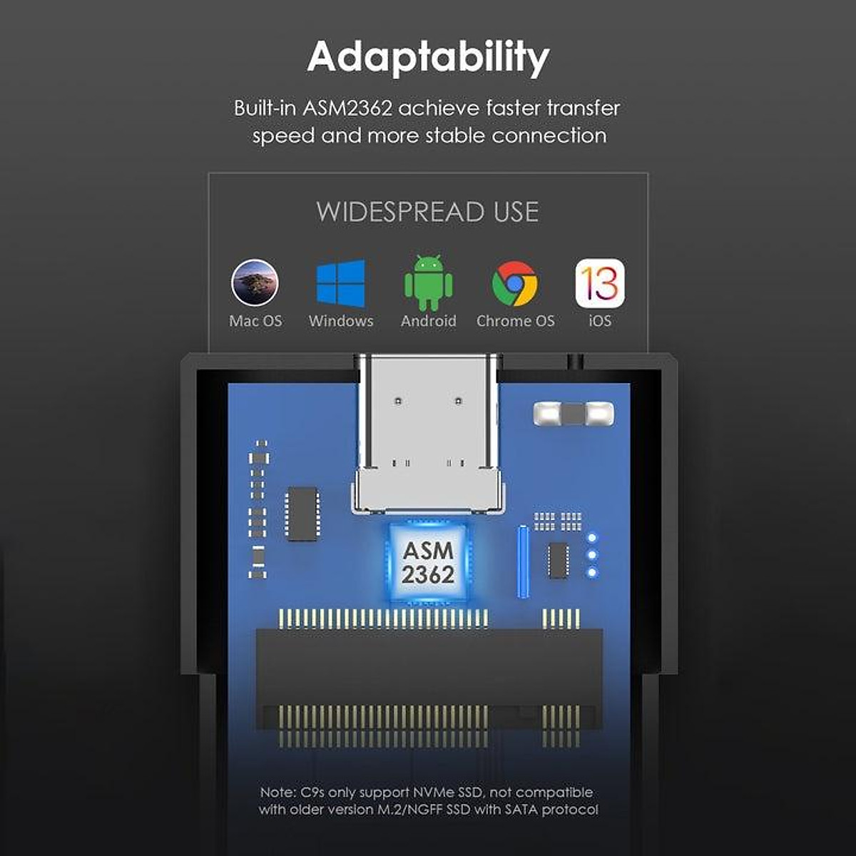 Mua tại TiktokBox ổ cứng SSD M2 NVMe 0.33m Lention C9s NVMe(M.2) SSD Case with 0.33m USB-C and USB-A Cable Biến SSD M2 NVMe thành ổ cứng di động Cổng USB C & A đến M.2 NVMe, Bộ điều hợp ổ cứng lên đến USB 3.1 Thế hệ 2 Tốc độ (10Gbps), Bao gồm cả Cáp USB-C và USB 3.0, Hỗ trợ SSD M.2 NVMe 2280 2260 2242 2230