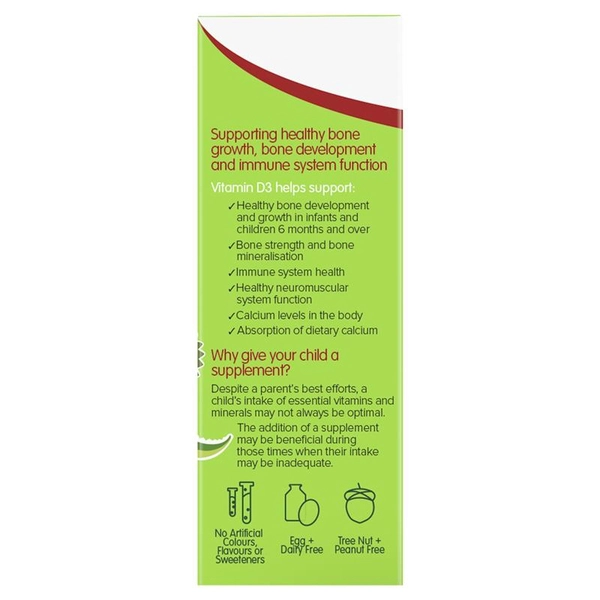 - Được thiết kế đặc biệt dành cho trẻ từ sơ sinh (đối tượng được khuyến cáo dùng vitamin D3 từ sớm), người cần bổ sung vitamin D3, người cần tăng cường sức đề kháng, nhân viên văn phòng, người ít ra nắng, người già Hướng dẫn sử dụng: