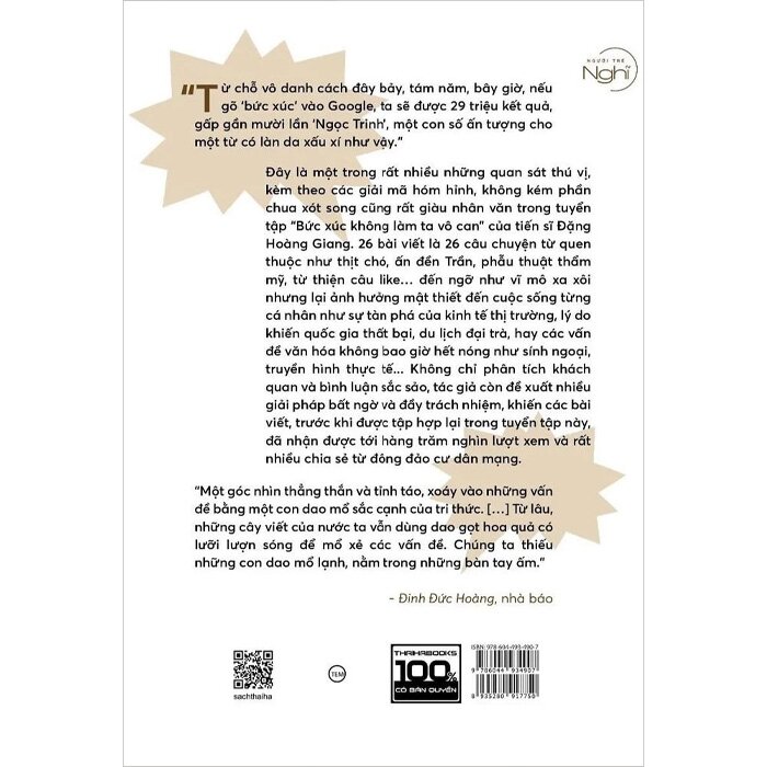 Bức Xúc Không Làm Ta Vô Can - Tái Bản Có Bổ Sung Đây là cuốn sách đầu tiên của tác giả Đặng Hoàng Giang, và cũng là cuốn tới nay được đọc rộng rãi nhất. Thuộc thể loại chính luận, 27 bài bình luận của cuốn sách lấy chủ đề là những hiện tượng xã hội và trào lưu văn hóa phổ thông quanh ta: đi du lịch, làm từ thiện, phẫu thuật thẩm mỹ hay truyền hình thực tế. Bằng ngòi bút sắc sảo, hài hước và tư duy phản biện, đa chiều, tác giả giúp chúng ta đi xuyên qua bề mặt của các hiện tượng, đặt câu hỏi về những điều tưởng như hiển nhiên, hiểu hơn về cơ chế vận hành của chúng, và về những hệ lụy mà chúng tạo ra cho cộng đồng.  Có thể nói, Bức xúc không làm ta vô can vẽ nên một chân dung của xã hội Việt Nam đương đại đang đứt gãy, hoang mang và trong xung đột của giao tranh giữa cũ và mới. Đọc sách sẽ giúp ta hiểu hơn về bản thân mình và về xã hội quanh ta.  Nhận xét dành cho cuốn sách Bức Xúc Không Làm Ta Vô Can - Tái Bản Có Bổ Sung “Đây thực sự là tác phẩm của một nhà phê bình xã hội (như chúng ta hiểu về cụm từ “nhà phê bình nghệ thuật”, “nhà phê bình văn học”) mà hiện nay Việt Nam còn thiếu. Khi xã hội hội đang trong vòng xoáy của một sự chuyển dịch dồn dập, lộn xộn như tại Việt Nam thì rất cần những cá nhân có công cụ sắc bén để giúp giải mã những trào lưu xã hội và hiện tượng văn hóa đang xuất hiện hằng ngày quanh chúng ta.” - Nhà hoạt động xã hội Tôn Nữ Thị Ninh “Sách của anh Giang buồn. Chính luận mà buồn. Vì nước ta bây giờ cái gì cũng có vẻ buồn. […] Nhưng cuối cùng, trong thâm tâm, tôi mong tác giả sẽ giữ tinh thần của cuốn sách này được nhiều năm nữa để tôi còn có cái mà đọc, không bị ảnh hưởng bởi những thứ quan điểm thị trường và sự lãng mạn kiểu đô thị. Một góc nhìn thẳng thắn và tỉnh táo, xoáy vào nhiều vấn đề bằng một con dao mổ sắc cạnh của tri thức.” - Nhà báo Đinh Đức Hoàng (Hoàng Hối Hận) Mục lục sách Bức Xúc Không Làm Ta Vô Can - Tái Bản Có Bổ Sung