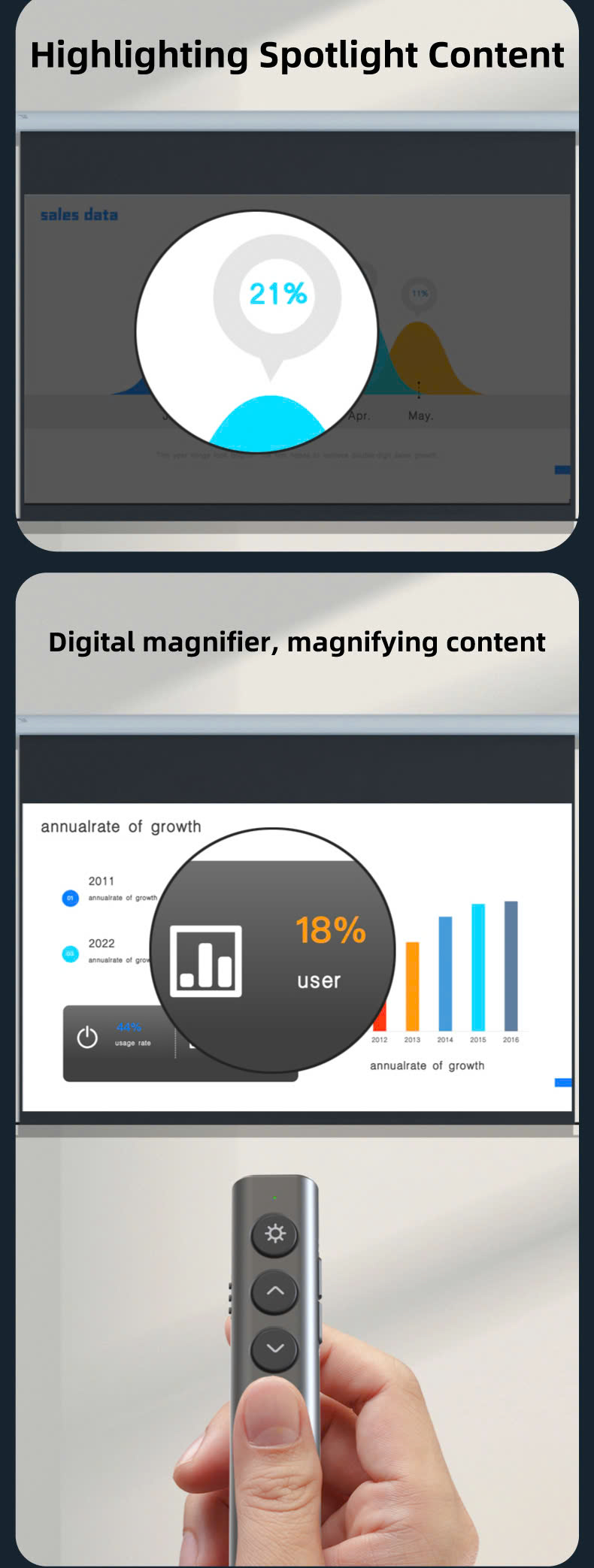 Laser xanh: Người dẫn chương trình không dây với tia laser màu xanh lá cây hiển thị tốt hơn trên nhiều nền khác nhau, ánh sáng xanh lục tươi sáng giúp bạn chỉ rõ mọi thứ