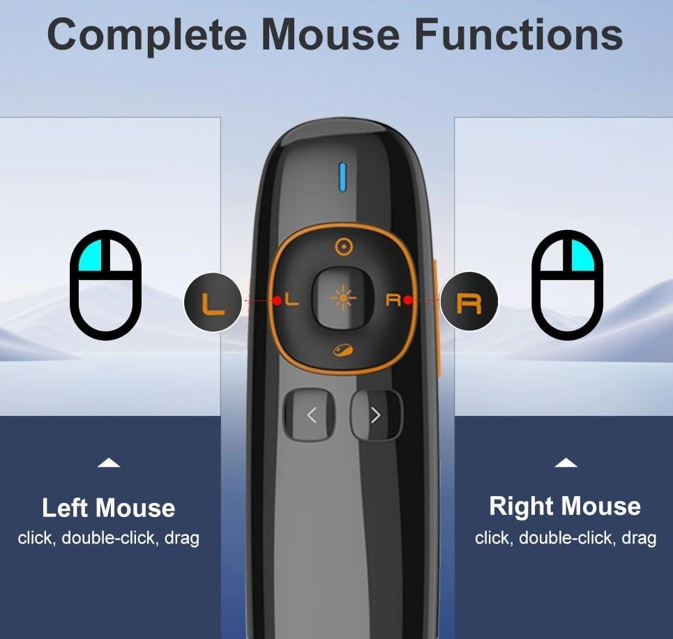 - Các buổi thuyết trình tại sự kiện lớn hoặc nhỏ. Với sự kết hợp giữa công nghệ tiên tiến và các tính năng linh hoạt, Norwii N86S giúp bạn không chỉ truyền tải thông điệp mà còn tạo ra trải nghiệm thuyết trình đáng nhớ. Đây chính là lựa chọn hoàn hảo để nâng tầm hiệu quả và chuyên nghiệp trong mỗi lần xuất hiện. Bút Trình Chiếu Kiêm Chuột Bay Norwii N86S Với 2 Nút Chuột Trái Và Chuột Phải Được Tích Hợp Trên Thiết Bị Tính Năng Chuột Bay của Norwii N86S Bút trình chiếu Norwii N86S không chỉ là một công cụ thuyết trình đa năng mà còn tích hợp tính năng chuột bay tiện lợi. Tính năng chuột bay cho phép bạn điều khiển con trỏ trên màn hình một cách mượt mà và chính xác, ngay cả khi di chuyển từ xa. Ngoài ra, bút trình chiếu còn được trang bị các nút chuột trái và chuột phải, mang lại sự linh hoạt tối đa trong việc tương tác với các ứng dụng và tài liệu. Những nút này hỗ trợ bạn thực hiện các thao tác cơ bản như chọn, nhấp, và kích hoạt các chức năng ngay từ thiết bị trình chiếu của mình. Với 3 Chế Độ Chuyển Đổi Trên Bút Trình Chiếu Norwii N86S Chuyển đổi chế độ trên bút trình chiếu Norwii N86S bằng cách nhấn và giữ đồng thời các phím “∧” và “∨”. Để điều chỉnh chế độ của bút trình chiếu, người dùng cần giữ các phím “∧” và “∨” trong 1 giây. Có ba chế độ chính: