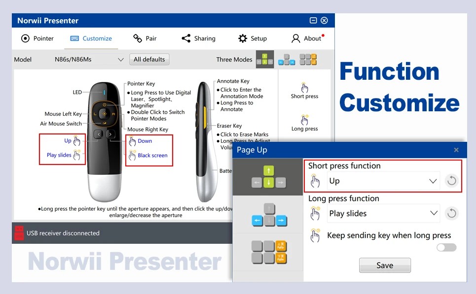 - Chế độ thứ ba: Các phím sẽ hoạt động như Trang lên và Trang xuống, phù hợp cho các trình duyệt web và trình xem đồ họa. Sau lần chuyển đổi thứ ba, các phím sẽ quay lại chức năng Phải và Trái. Bút trình chiếu kỹ thuật số Norwii N86S sẽ ghi nhớ cài đặt của bạn để sử dụng cho lần tiếp theo. Bút Trình Chiếu Kiêm Chuột Bay Norwii N86S Với Khả Năng Tuỳ Chỉnh Linh Hoạt Tùy chỉnh chức năng trên Norwii N86S Mặc dù bút trình chiếu kỹ thuật số kiêm chuột bay Norwii N86S có ba chế độ chuyển đổi giữa các chức năng, một số ứng dụng vẫn yêu cầu các phím tắt riêng biệt, như các chức năng phát, tạm dừng, bài trước và bài tiếp theo cho trình phát media. Tính năng tùy chỉnh chức năng cho phép người dùng thiết lập các phím tắt cụ thể cho từng phím trên thiết bị. Để thực hiện tùy chỉnh, hãy làm theo các bước sau: