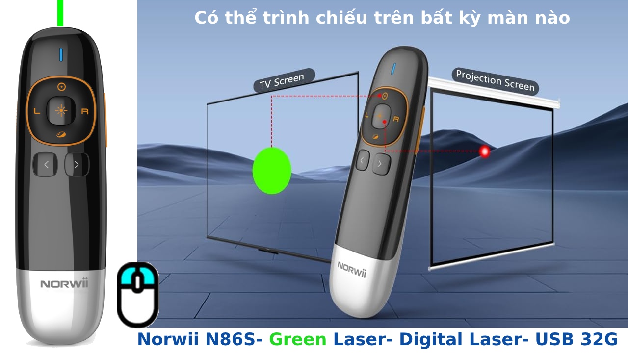 Bút trình chiếu kĩ thuật số Laser xanh cho màn chiếu và màn hình NORWii N86S, Hàng Chính Hãng Bút trình chiếu kỹ thuật số kiêm chuột bay laser màu xanh Norwii N86S là một giải