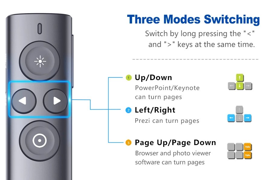 Laser xanh: Người dẫn chương trình không dây với tia laser màu xanh lá cây hiển thị tốt hơn trên nhiều nền khác nhau, ánh sáng xanh lục tươi sáng giúp bạn chỉ rõ mọi thứ