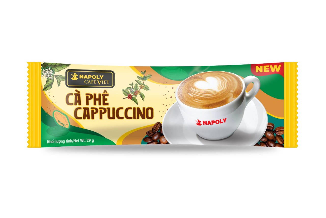 Mua tại TiktokHộp nhỏ cà phê sữa hòa tan Cappuccino đậm vị cà phê, sữa ngọt ngào, Socola béo ngậy thơm lừng Napoly Coffee (5gói x 29g) NAPOLI – CÀ PHÊ VIỆT – ĐẬM GU ĐÚNG CHẤT • CÀ PHÊ SẠCH: