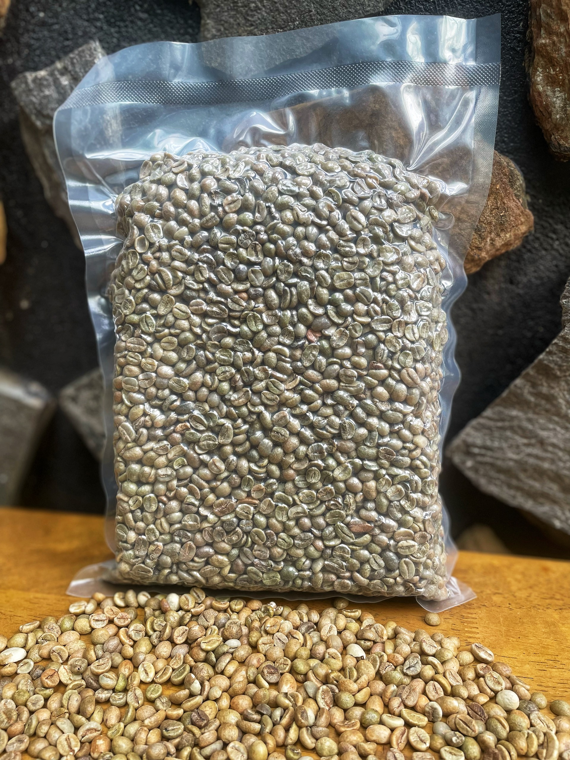 Cà phê nhân xanh Arabica Moka chưa qua chế biến. Moka của baka sử dụng nguyên liệu từ những vườn cà phê thuần arabica ít ỏi còn sót lại bên sườn núi Ngọc Linh, vùng