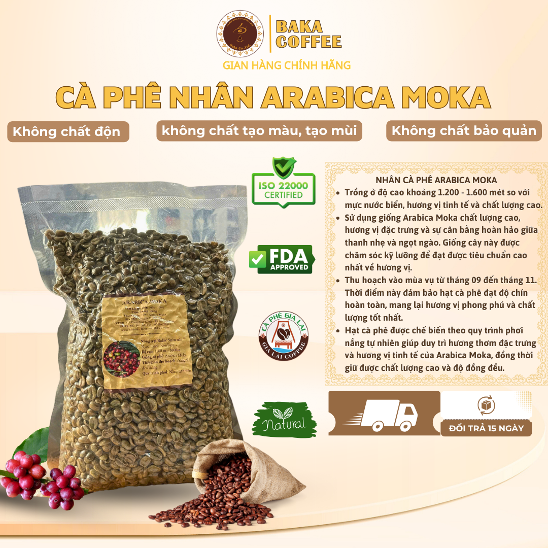 Mua tại TiktokCà phê nhân xanh Arabica Moka chưa qua chế biến. Moka của baka sử dụng nguyên liệu từ những vườn cà phê thuần arabica ít ỏi còn sót lại bên sườn núi Ngọc Linh, vùng đất nổi danh với loại sâm cùng tên. Ở độ cao trên 2000m, arabica ở đây được đồng bào quảng canh gần như là cây rừng, bà con để cây mọc và trời đất chăm bón, tới mùa thì đeo gùi lên hái nên năng suất chẳng cao mà trái cũng chẳng to, Nhưng chất lượng thì tuyệt hảo. Mùi thơm nhẹ nhàng nhưng rất sang, mùi thơm len lỏi đến tận áo quần người uống và đến tận khi uống hết ly vẫn còn thơm. Mùi vị của moka baka rất phong phú, về cơ bản thì vị chát nhẹ, hơi chua, không đắng lắm, mỗi người uống lại cảm nhận khác nhau với loại cà phê tuyệt vời này.