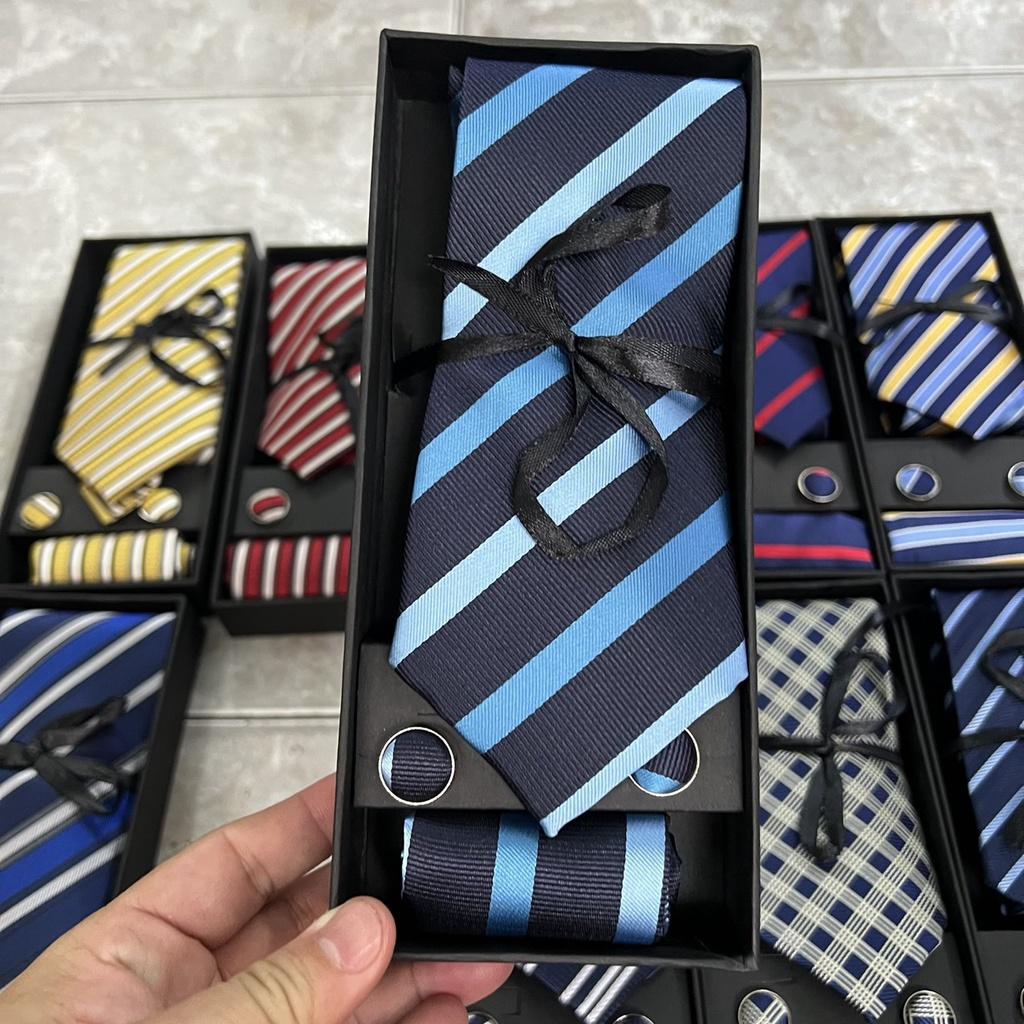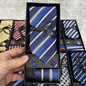 Hộp quà tặng gồm 1 cà vạt nam 8cm kích cỡ chuẩn 8cmx150 k. 1 hộp đựng cà vạt , 01 Khăn túi áo véc 20x20 cm , 1 cặp khuy áo măng sét cũng