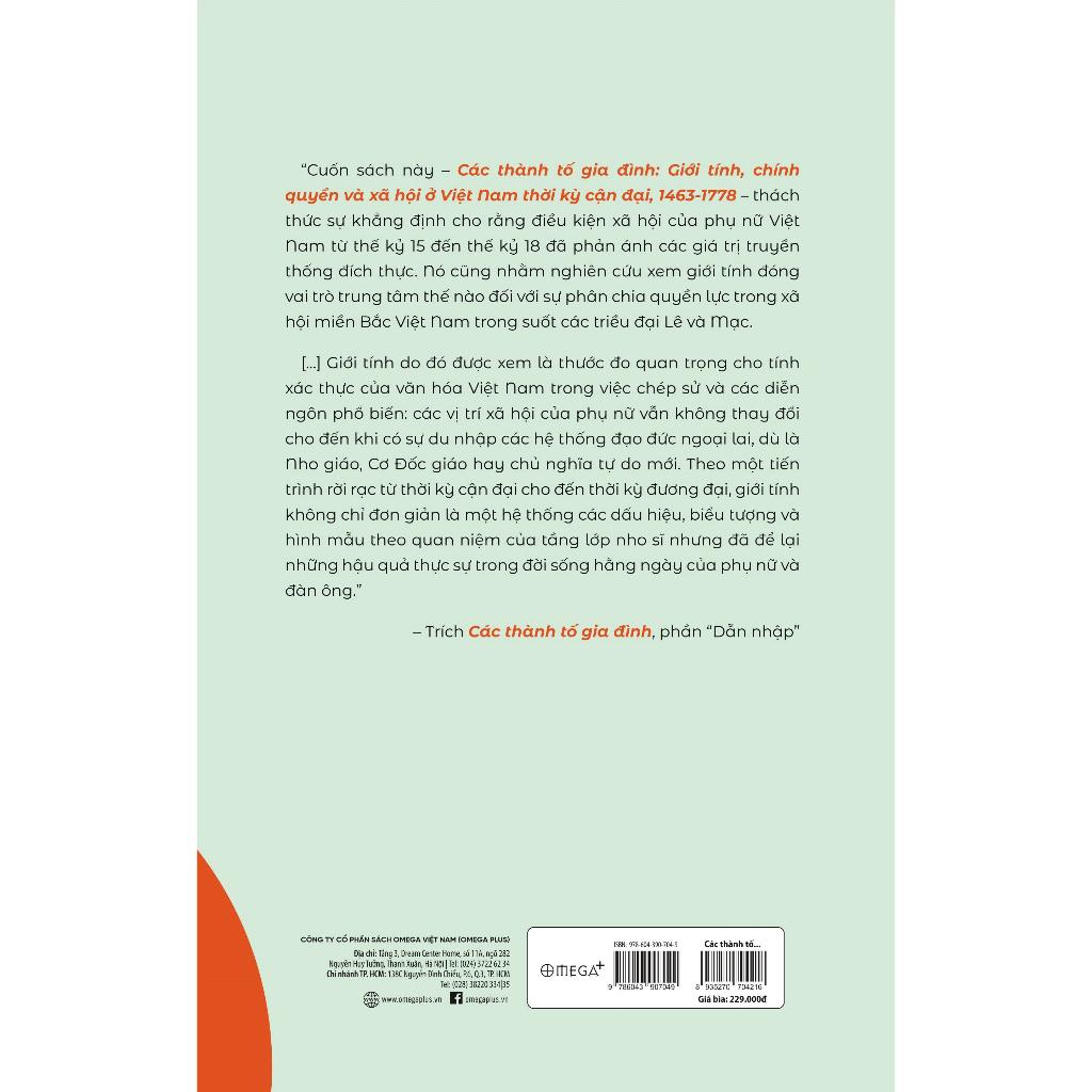 Cuốn sách Các thành tố gia đình: Giới tính, chính quyền và xã hội ở Việt Nam thời kỳ cận đại, 1463-1778 của tác giả Trần Tuyết Nhung gồm 6 chương, phân tích các nội dung: