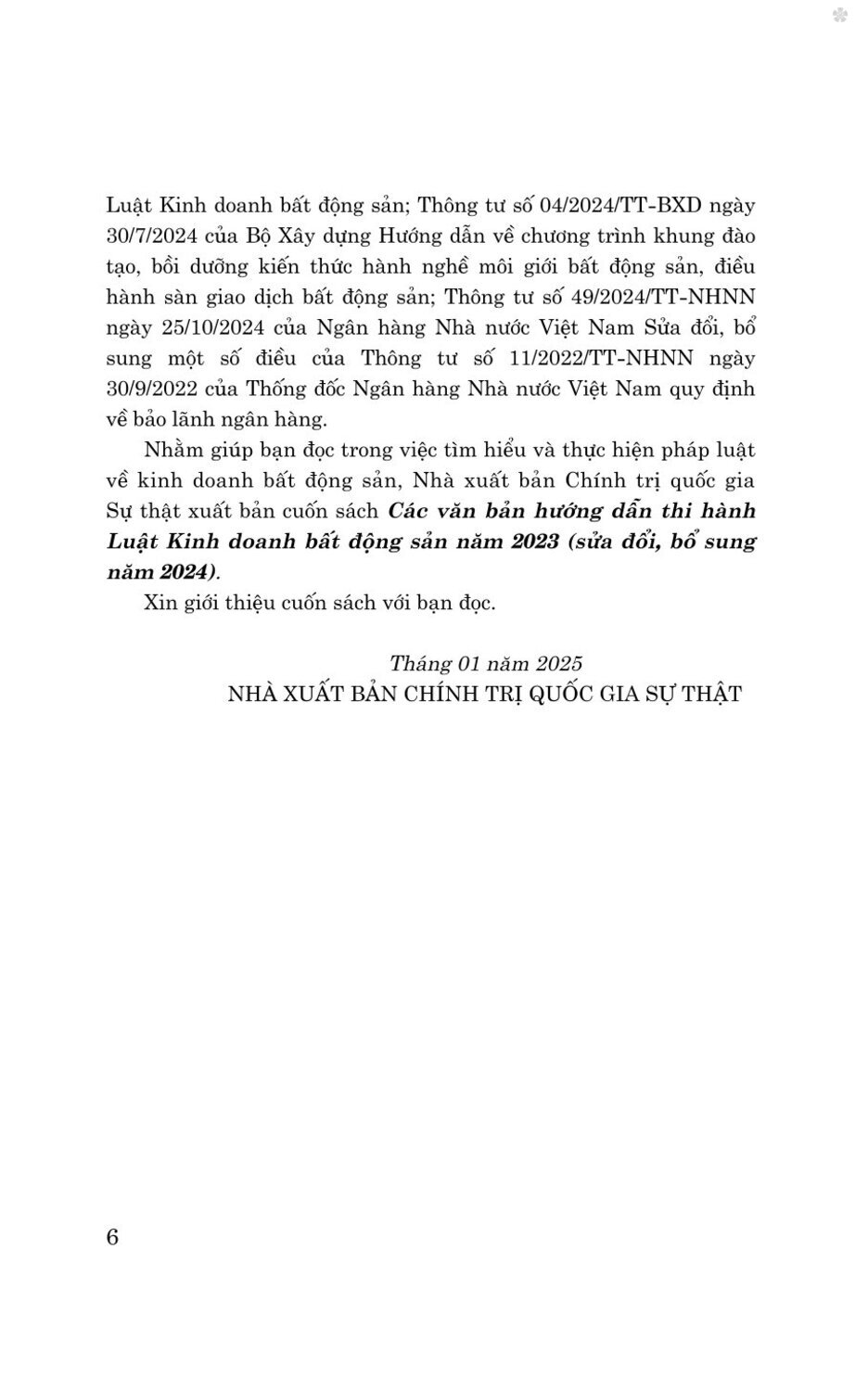 Nhằm giúp bạn đọc trong việc tìm hiểu và thực hiện pháp luật về kinh doanh bất động sản, Nhà xuất bản Chính trị quốc gia Sự thật xuất bản cuốn sách Các văn bản hướng dẫn thi hành Luật Kinh doanh bất động sản năm 2023 (sửa đổi, bổ sung năm 2024).