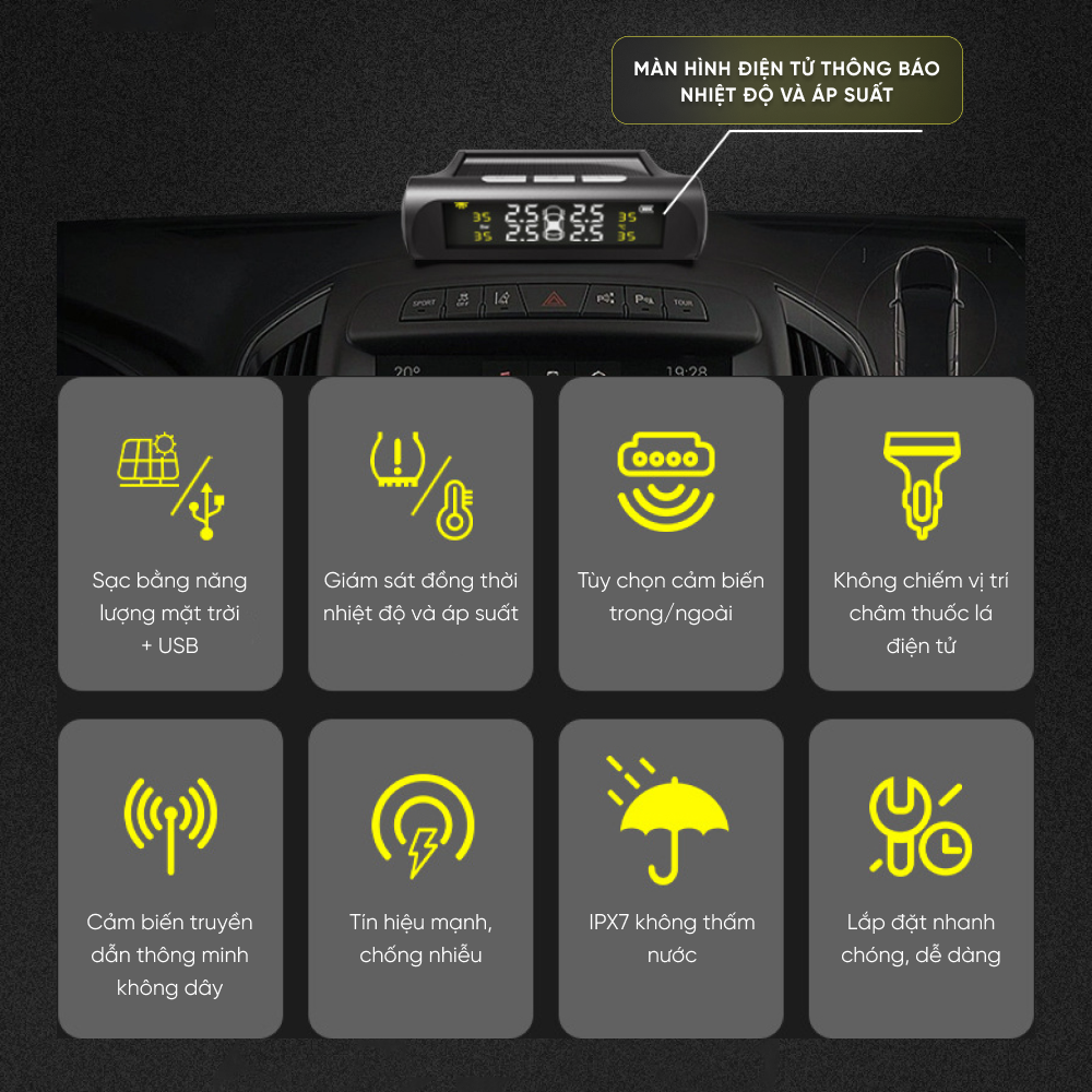 Cảm biến áp suất lốp ô tô TPMS, hiển thị LED màu, có tín hiệu cảnh báo bằng âm thanh