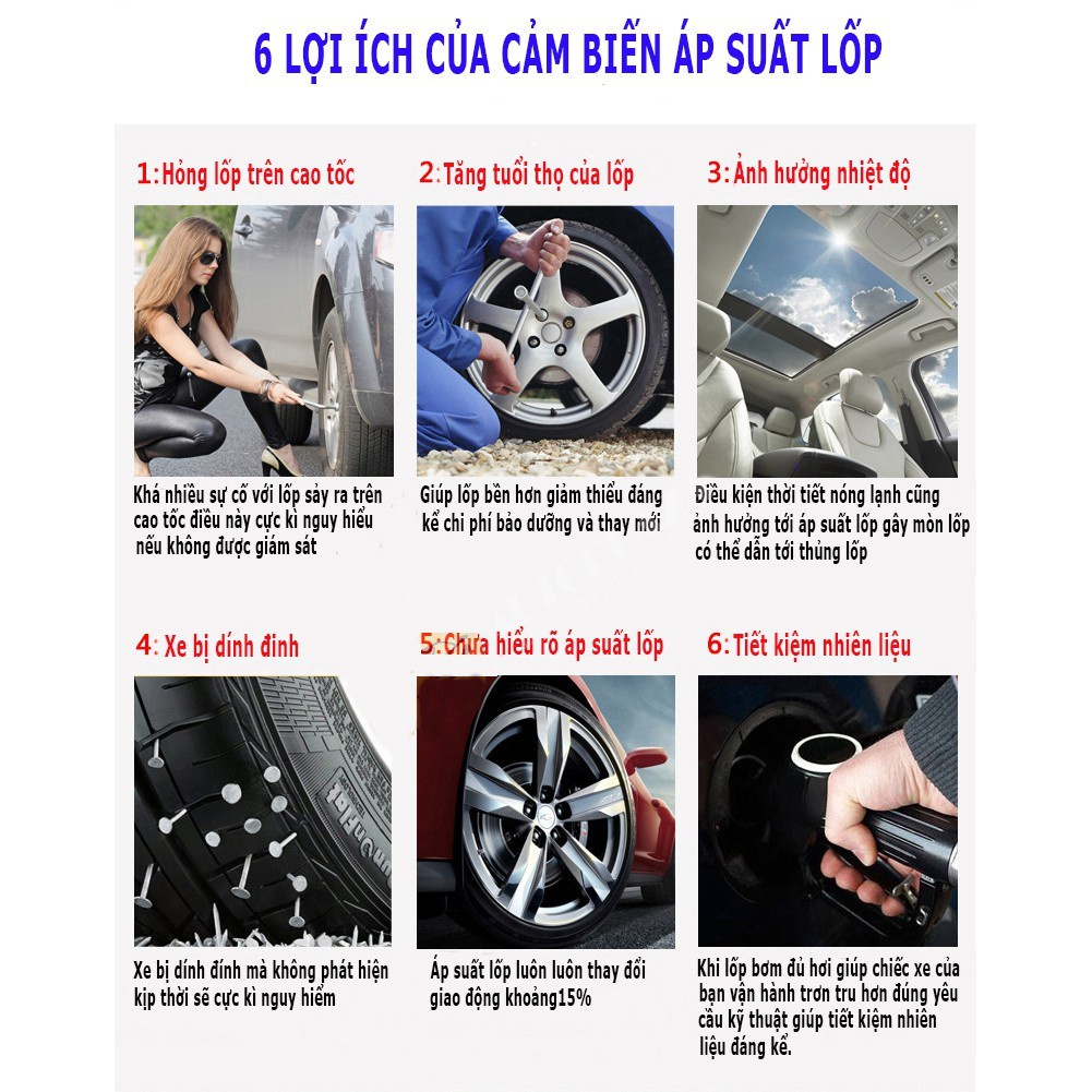 - Công dụng, tính năng của sản phẩm Cảm biến áp suất lốp ô tô TPMS màn hình led màu Kiểm soát các vấn đề về lốp luôn được người sử dụng ô tô quan tâm hàng đầu. Còn gì tuyệt vời hơn khi bạn chỉ việc ngồi trong xe mà vẫn hoàn toàn có thể kiểm soát được áp suất và nhiệt độ từng lốp xe của mình mà không phải trực tiếp ra ngoài tận mắt kiểm tra nữa! Được sản xuất trên công nghệ tiên tiến nhất , Cảm biến áp suất lốp ô tô TPMS màn hình led màu thông minh theo dõi từng thay đổi nhỏ nhất của nhiệt độ và áp suất lốp, có cảnh báo bằng âm thanh và hình ảnh tới bạn mỗi khi áp suất lốp quá thấp 3,3 Bar hoặc nhiệt độ lốp > 70 độ C.