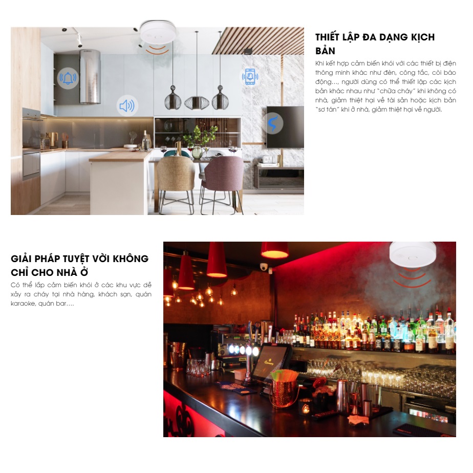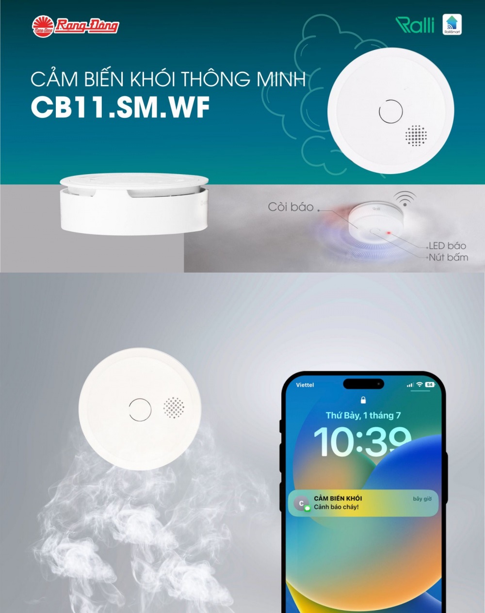 Cảm biến khói báo cháy thông minh Rạng Đông CB11.SM.WF kết nối wifi không dây điều khiển từ xa qua app Thương hiệu Rạng Đông uy tín tin cậy được khẳng định bởi người tiêu dùng Việt Nam và quốc tế Model: CB11.SM.WF Nguồn cung cấp: Pin CR123A Điện áp: 3V Dải nhiệt độ hoạt động: (-10 - 50)°C Dải độ ẩm hoạt động: (0 - 95)% Âm thanh báo động: ≥85 dB/m Kích thước (ØxC): (86x32)mm ️ Ứng dụng: Gắn trần, gắn tường, khu vực hành lang, cầu thang, nhà vệ sinh, gara,... những khu vực có nguy cơ xảy ra hỏa hoạn. Thân thiện môi trường   VỆ SĨ BẢO VỆ NGƯỜI VÀ TÀI SẢN Cảm biến khói sẽ ngay lập tức phát âm thanh cảnh báo ≥85dB đồng thời gửi cảnh báo về smartphone và kích hoạt kịch bản chữa cháy giảm thiểu thiệt hại về người và tài sản ngay khi phát hiện sự xuất hiện của khói trong không khí. KÍCH THƯỚC NHỎ GỌN, LẮP ĐẶT LINH HOẠT Với thiết kế nhỏ gọn, sử dụng pin CR123A, người dùng có thể đặt cảm biến khói ở những khu vực dễ xảy ra cháy hay bất kỳ khu vực nào muốn tăng cường sự an toàn cho gia đình, tiết kiệm không gian và đảm bảo thẩm mỹ cho ngôi nhà. THIẾT LẬP ĐA DẠNG KỊCH BẢN Khi kết hợp cảm biến khói với các thiết bị điện thông minh khác như đèn, công tắc, còi báo động…, người dùng có thể thiết lập các kịch bản khác nhau như “chữa cháy” khi không có nhà, giảm thiệt hại về tài sản hoặc kịch bản “sơ tán” khi ở nhà, giảm thiệt hại về người. GIẢI PHÁP TUYỆT VỜI KHÔNG CHỈ CHO NHÀ Ở Có thể lắp cảm biến khói ở các khu vực dễ xảy ra cháy tại nhà hàng, khách sạn, quán karaoke, quán bar…. Ưu điểm sản phẩm KẾT NỐI VÀ ĐIỀU KHIỂN KHÔNG DÂY WIFI Sản phẩm sử dụng công nghệ kết nối và điều khiển không dây Wi-Fi, người dùng có thể mua về, cài đặt và sử dụng ngay mà không cần đến bộ điều khiển trung tâm. GỬI THÔNG BÁO VỀ ĐIỆN THOẠI Khi phát hiện nguy hiểm, cảm biến khói sẽ ngay lập tức kích hoạt kịch bản báo động đồng thời gửi thông báo về smartphone. Dù ở đâu, mọi thứ đều trong tầm kiểm soát.. TÍNH NĂNG SẢN PHẨM CẤU TẠO SẢN PHẨM