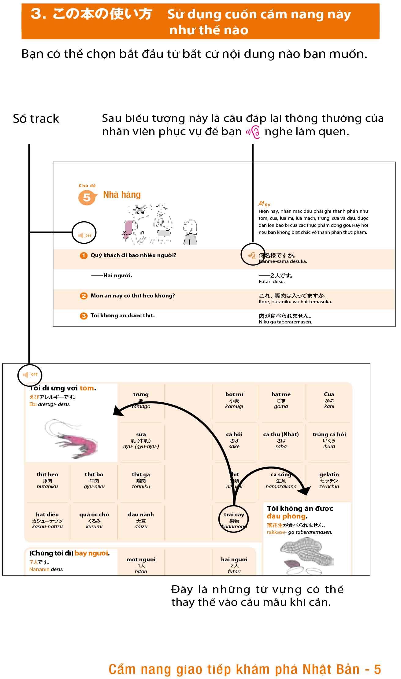 Phần 2 & 3: giới thiệu các từ và cụm từ tiếng Nhật hữu dụng khi đi mua sắm ở cửa hàng tiện lợi, giao tiếp ở nhà hàng và bệnh viện. Phần 3 hướng dẫn những từ và cụm từ tiếng Nhật được dùng trong những tình huống như giới thiệu về bản thân, sử dụng các phương tiện truyền thông hay hẹn gặp ai đó.