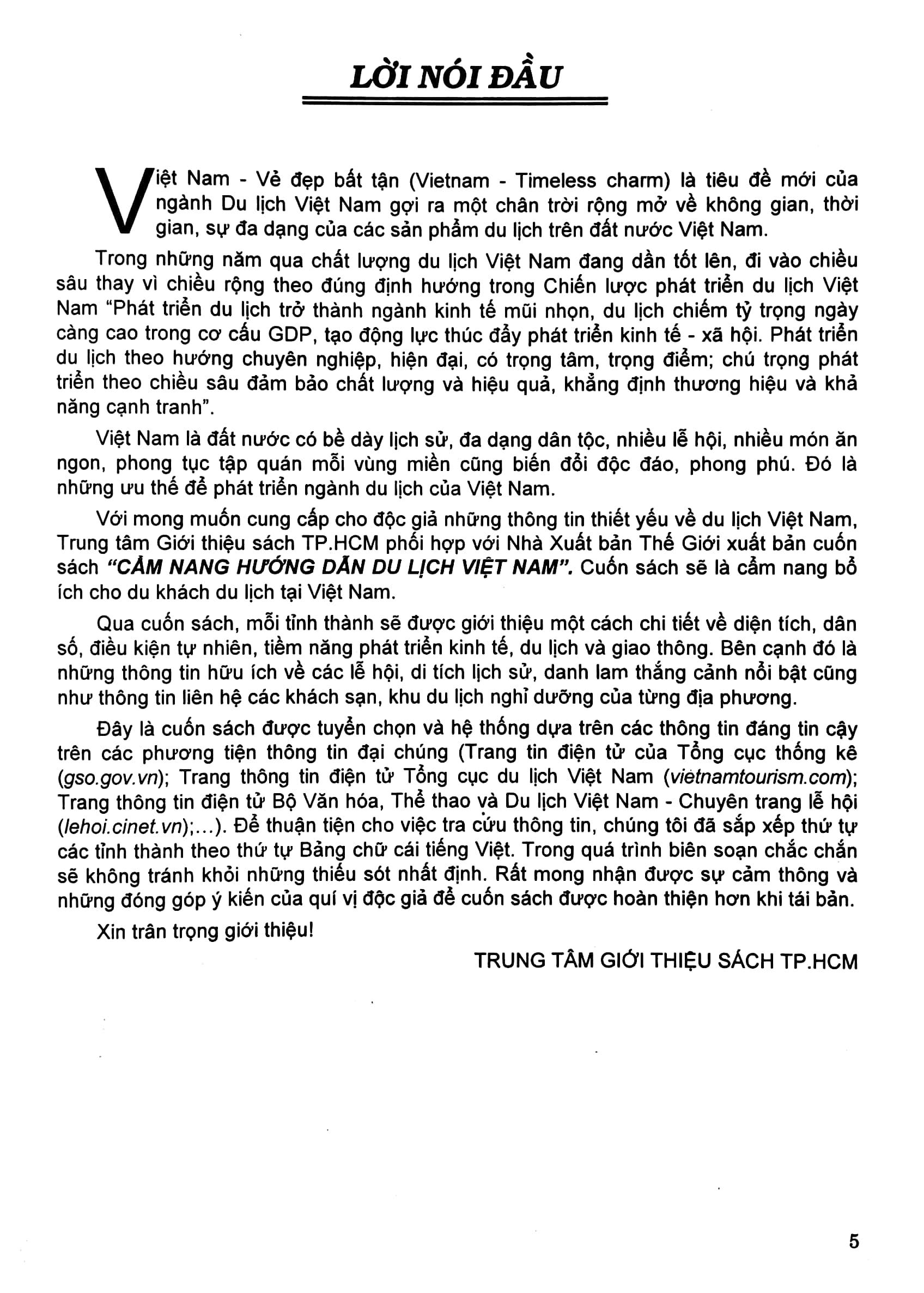 Với mong muốn cung cấp cho độc giả những thông tin thiết yếu về du lịch Việt Nam, quyển Cẩm Nang Hướng Dẫn Du Lịch Việt Nam đã được xuất bản và sẽ là cẩm nang bổ ích cho du khách du lịch tại Việt Nam. Sách gồm 63 phần giới thiệu về du lịch của 63 tỉnh, thành phố trong cả nước theo thứ tự bảng chữ cái tiếng Việt để thuận tiện cho việc tra cứu thông tin.