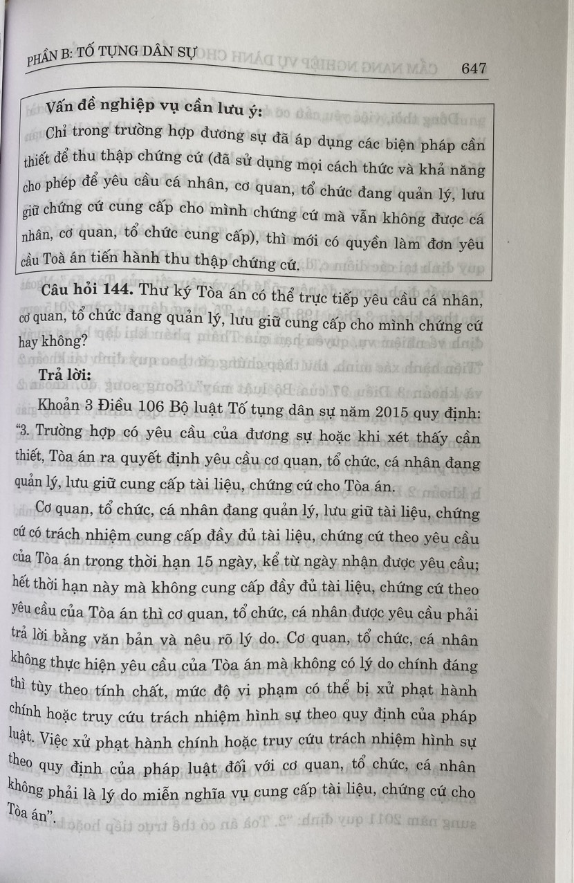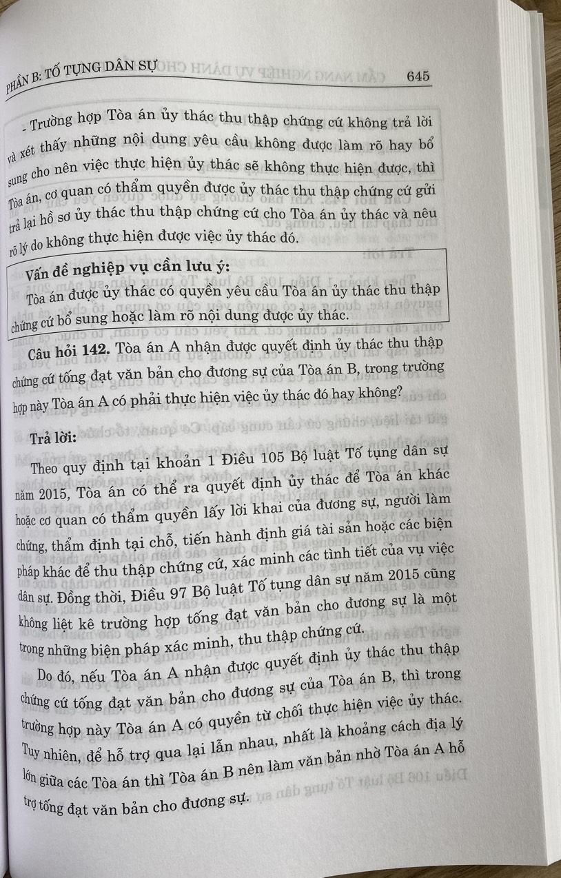 Mua tại TiktokCuốn sách gồm hai phần chính về dân sự và tố tụng dân sự, trong mỗi phần tác giả đưa ra những câu hỏi, những tình huống liên quan đến một số lĩnh vực thường phát sinh tranh chấp và cách giải quyết cụ thể trên cơ sở các quy định của Bộ luật Dân sự và Bộ luật Tố tụng dân sự hiện hành; các nghị quyết của Hội đồng Thẩm phán Tòa án nhân dân tối cao, các giải đáp, hướng dẫn nghiệp vụ của Ngành Tòa án.