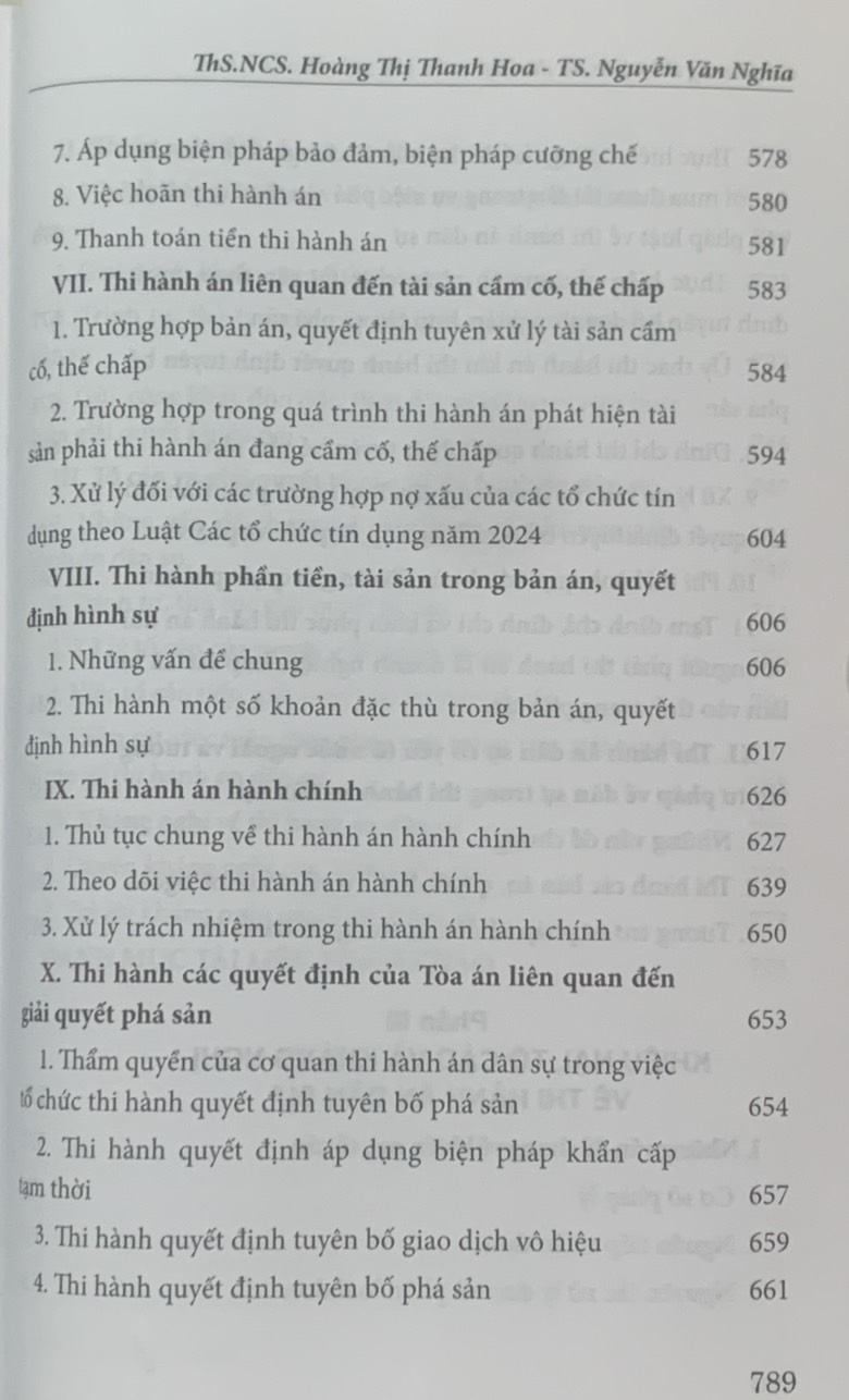 Để đáp ứng nhu cầu tra cứu nhanh, chính xác các quy định của pháp luật thi hành án dân sự và các quy định của pháp luật khác có liên quan trong quá trình tổ chức thi hành bản án, quyết định của Tòa án, đồng thời chỉ ra một số vướng mắc trong các quy định của pháp luật khi áp dụng vào các tình huống thi hành án cụ thể giúp Chấp hành viên áp dụng chính xác pháp luật, hạn chế thấp nhất sai sót có thể xảy ra, tránh thiệt hại thuộc phạm vi trách nhiệm bồi thường của Nhà nước và tránh gây thiệt hại cho các bên đương sự, Nhà xuất bản Tư pháp giới thiệu cuốn: “Cẩm nang thi hành án dân sự” (Tái bản lần thứ hai, có sửa đổi, bổ sung) của ThS.NCS. Hoàng Thị Thanh Hoa và TS. Nguyễn Văn Nghĩa.