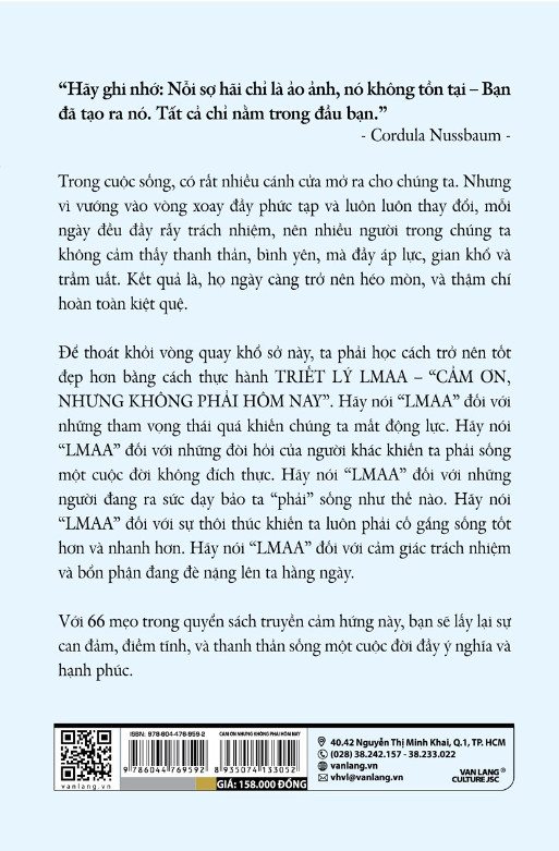 Mua tại TiktokCẢM ƠN NHƯNG KHÔNG PHẢI HÔM NAY - TRIẾT LÝ LMAA - 66 Mẹo Giúp Phá Vỡ Rào Cản, Đập Tan Khuôn Mẫu, Dũng Cảm Và Sống Trí Tuệ - Cordula Nussbaum - Nguyễn Thị Thùy Trang dịch - (bìa mềm) - Giá bìa: 158.000đ