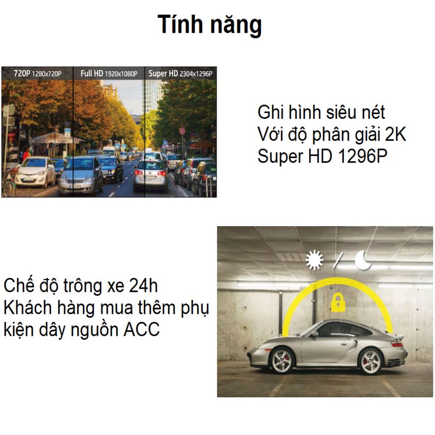 Độ phân giải video : 2K 1440P Ống kính : Camera trước 150° Ghi hình vòng lặp : Có Wifi : Có GPS : Có Công nghệ hình ảnh giảm nhiễu Hỗ trợ tái hiện