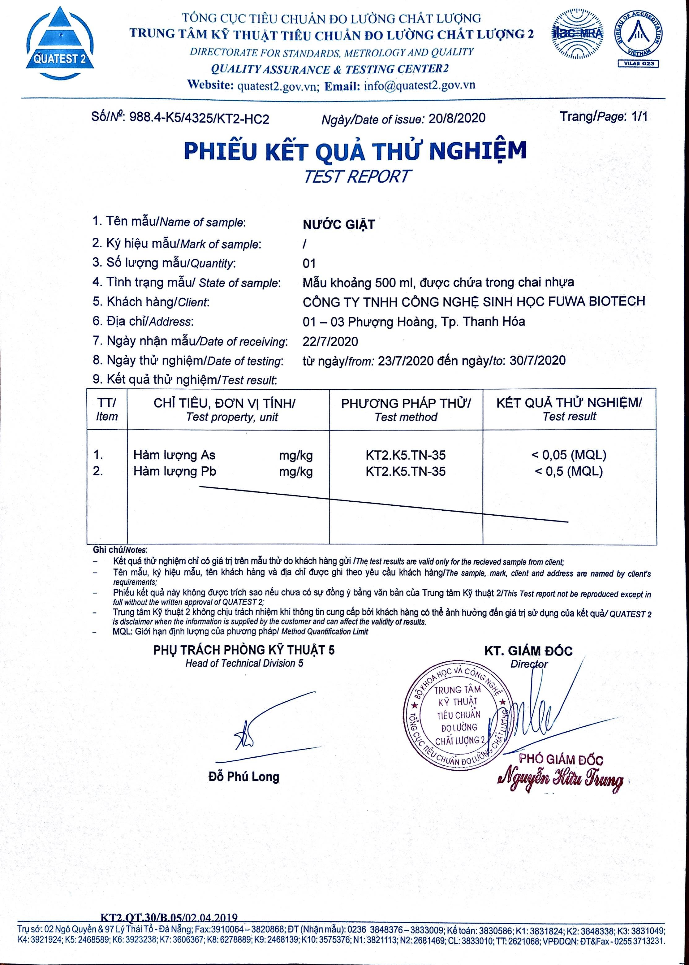 Nước giặt hữu cơ Fuwa3e ứng dụng công nghệ lên men vỏ dứa với Enzyme Bromelain trong dứa có hoạt tính làm tan và tẩy sạch các vết bẩn. Sản phẩm không chứa hoá chất độc hại, chất tẩy trắng và hương liệu nên phù hợp giặt đồ cho trẻ sơ sinh, đồ lót, khăn. Sản phẩn đạt chuẩn không kích ứng da được kiểm định bởi Quatest 2. Một đặc điểm nổi bật của sản phẩm là nước thải sau khi giặt có thể dùng trực tiếp để tưới cây, các enzyme trong nước thải sẽ làm sạch đất và cung cấp thêm lợi khuẩn cho cây trồng. Sản phẩm Refill 10L là một trong những nỗ lực của Fuwa3e trong việc giảm thiểu nhựa đựng và giúp tiết kiệm chi phí hơn so với mua từng chai nhỏ.