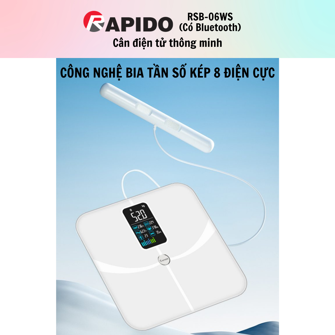 Mua tại TiktokƯU ĐIỂM NỔI BẬT: - Công nghệ đo BIA tần số kép 8 điện cực - Đo chính xác 25 chỉ số cơ thể - Tạo báo cáo phân tích body chuyên nghiệp - Màn LCD lớn, hiển thị trực quan rõ ràng - Kết nối app Fitdays, theo dõi và quản lý định hình cơ thể - Kính cường lực phủ ITO toàn mặt kính - Thiết kế cân bằng tối ưu, chống lật, chống trượt - Bộ nhớ lưu trữ số liệu tối đa 24 người THÔNG SỐ KỸ THUẬT: - Thương hiệu: Rapido - Tên sản phẩm: Cân sức khỏe thông minh - Model: Rapido RSB-09WS - Kích thước: 30 x 30 x 2.75 cm - Màn hình; 10.7 x 6.2 cm - Cân tối đa: 180kg/400lb - Pin Lithium 300mAh - Nguồn sạc Type-C Sport