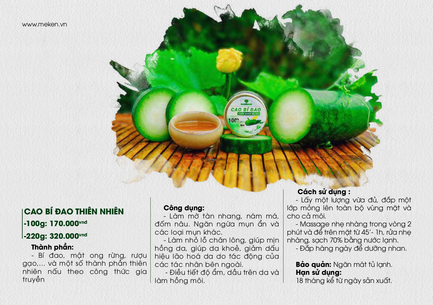 CAO BÍ ĐAO MẸ KEN THIÊN NHIÊN MẸ KEN (100g) THÀNH PHẦN: - Bí đao, mật ong rừng, rượu gạo, … và một số thành phần thiên nhiên nấu theo công thức gia truyền. - Vì là thành phần hoàn toàn từ thiên nhiên có thể ăn được, dùng cho phụ nữ có thai và cho con bú cực kỳ an toàn, nên hoàn toàn ko kích ứng, không phụ thuộc, không bắt nắng, dùng để dưỡng nhan. CÔNG DỤNG: - Là một bài thuốc dưỡng nhan tuyệt vời của Lương Y Tuệ Tĩnh. - Làm mờ tàn nhang, nám má, đốm nâu. Ngăn ngừa mụn ẩn và các loại mụn khác. - Làm nhỏ lỗ chân lông, giúp mịn hồng da, giúp da khoẻ, giảm dấu hiệu lão hoá da do tác động của các tác nhân bên ngoài. - Điều tiết độ ẩm, dầu trên da và làm hồng môi. HƯỚNG DẪN SỬ DỤNG: - Lấy một lượng vừa đủ, đắp một lớp mỏng lên toàn bộ vùng mặt và cho cả môi. - Massage nhẹ nhàng trong vòng 2 phút và để trên mặt từ 45’- 1h, rửa nhẹ nhàng, sạch 70% bằng nước lạnh. - Đắp hàng ngày để dưỡng nhan. BẢO QUẢN: bảo quản trong ngăn mát tủ lạnh hoặc bên ngoài nhiệt độ dưới 30 độ C HẠN DÙNG: 18 tháng kể từ ngày sản xuất
