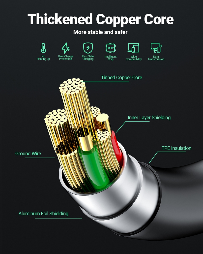 1. Chiều dài 1,2m. Trọng lượng: 42g. 2. Chất liệu bên ngoài: nylon dệt. 3. Chất liệu đầu nối: hợp kim nhôm. 4. Lõi: 178 dây đồng năm lõi, dòng điện lên đến 3A. 5.
