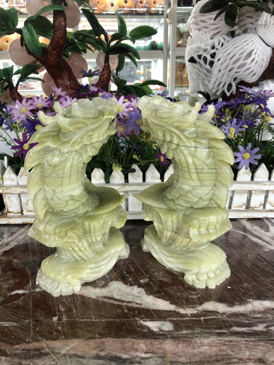 Chất liệu: Đá ngọc hoàng long Kích thước: Dài 30 cm x Rộng 10 cm x Cao 16,5 cm Khối lượng: 1,9 kg Do cá rồng là loài cá tượng trưng cho quyền lực oai
