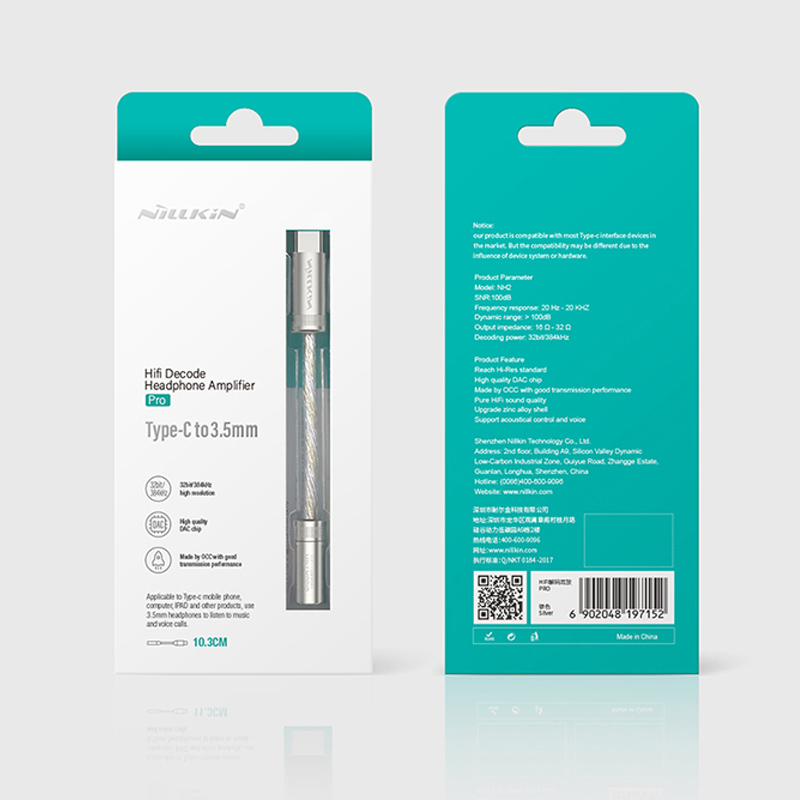 - Chất lượng âm thanh Hi-Fi Mô tả sản phẩm Cáp chuyển Type-C to 3.5mm NILLKIN Hifi Decode Headphone Amplifier PRO Cáp chuyển Type-C to 3.5mm NILLKIN Hifi Decode Headphone Amplifier PRO với thiết kế cực kì nhỏ gọn, âm thanh với chất lượng và hiệu suất tuyệt vời, thiết kế đặc biệt dành cho người yêu âm nhạc. Chip DAC hiệu năng cao và PCM lên đến 32bit / 384kHz để bạn đắm chìm vào hành trình âm nhạc Hifi. Dây dẫn đồng tinh thể đơn có độ tinh khiết cao có đặc tính truyền tải ổn định và khả năng phân giải cao. Vật liệu hợp kim kẽm chọn lọc được xử lý bằng công nghệ mạ điện. Phích cắm ID đã thử nghiệm phích cắm khoảng 10.000 lần, bằng chứng tốt về độ bền mạnh mẽ của nó. Thiết kế nhỏ gọn, âm thanh tuyệt vời Cáp chuyển Type-C to 3.5mm NILLKIN Hifi Decode Headphone Amplifier PRO Thiết kế gọn nhẹ , nó giúp bạn có thể mang chúng đến bất kỳ đâu một cách dễ dàng. Thiết bị này phù hợp với hầu hết các thiết bị di động hay Macbook sử dụng cổng Type-C. Ngoài ra với phần dây được bện siêu chắc chắn từ vật liệu TPE tổng hợp giúp cho việc không bị đứt gãy khi cầm nắm sử dụng hay di chuyển. Truyền tải âm thanh chất lượng cao 32 bit / 384kHz, giúp tái tạo và truyền tải âm thanh Hifi. Hỗ trợ PCM Decoding Công nghệ chip DAC Cáp chuyển Type-C to 3.5mm NILLKIN Hifi Decode Headphone Amplifier PRO Tích hợp chip DAC giảm nhiễu âm thanh chất lượng cao, thiết kế có độ trung thực cao để đảm bảo tín hiệu âm thanh truyền ổn định và không bị suy hao, chất lượng âm thanh sẽ không bị giảm khi truyền tải. Hỗ trợ lọc tiếng ồn hiệu quả cho tai nghe, giúp bận tận hưởng phút giây âm nhạc thoải mái và thực hiện những cuộc gọi với âm thanh rõ ràng, trung thực Công nghệ dây dẫn OCC Cáp chuyển Type-C to 3.5mm NILLKIN Hifi Decode Headphone Amplifier PRO với Dây dẫn đồng tinh thể đơn OCC giúp hỗ trợ quá trình truyền tải âm thanh được rõ ràng, lọc âm hiệu quả, giúp bạn tận hưởng âm thanh Hifi. Tương thích với nhiều thiết bị Cáp chuyển Type-C to 3.5mm NILLKIN Hifi Decode Headphone Amplifier PRO hỗ trợ hầu hết các điện thoại di động có cổng Type-C: Galaxy S20 Ultra/S20+/S20/S10/S9/Note 10+ /Note 10, iPad Pro 12.9 2020/2018, ipad pro 11 2020/2018, Macbook Air/Macbook pro 13/16, One plus 8/7 Pro/7/6T, Google Pixel 4/Pixel 3/Pixel Hình ảnh sảnh phẩm Thông số kỹ thuật