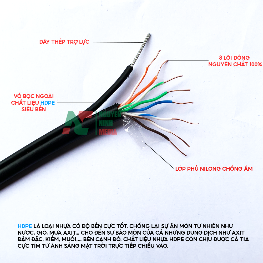✨Cáp Mạng Ngoài Trời HIDEKI Cat5e 8 Lõi Đồng, Có Sợi Thép Chịu Lực, Vỏ HDPE Siêu Bền -Hàng Chính Hãng