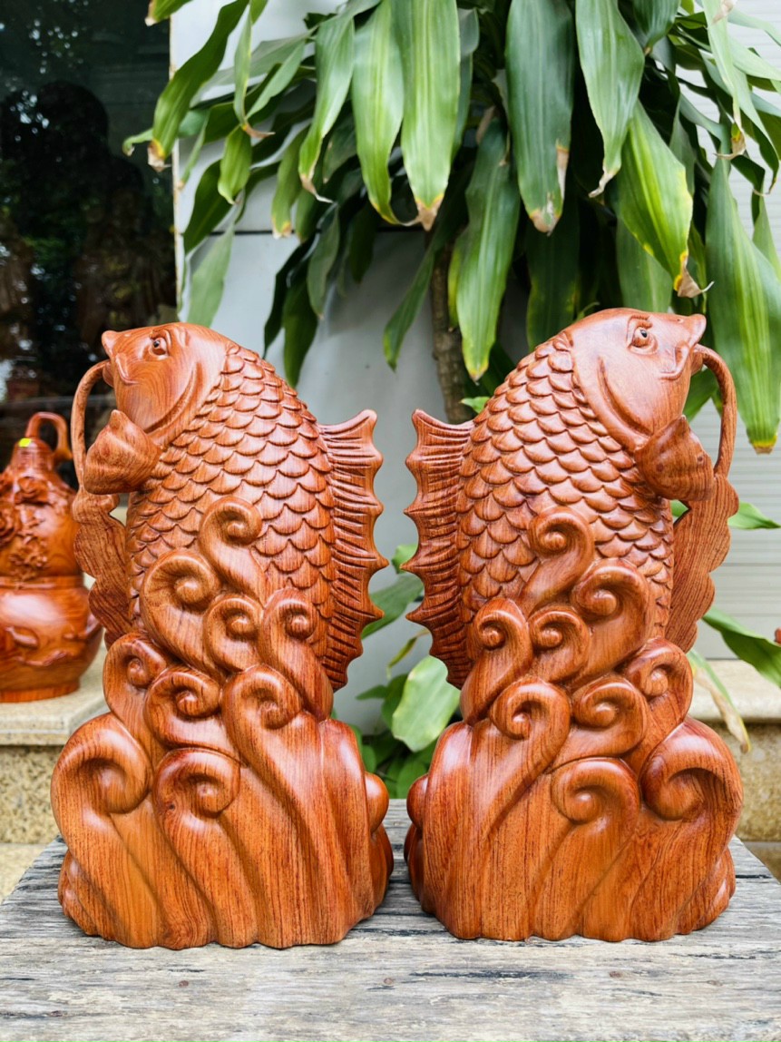 Cặp tượng cá chép phong thủy hút tài lộc được làm bằng chất liệu gỗ hương đá liền khối tự nhiên 100%  Kích thước cao 30×19×12cm _ Cặp tượng cá chép phong thủy hút tài lộc được trạm khắc tỉ mỉ tinh sảo kỳ công .Đi hầu hết tất cả mọi chi tiết góc ngách nội dung hoa văn của tượng đều được ngọt tỉa ,Chỉnh sửa hoàn toàn bằng tay thủ công .Kết hợp với trà nhám đánh giấy giáp kỹ nhiều lần cho sạch sẽ ,sờ mát lạnh ,Rồi cho vào phun lót làm bóng mờ để giữ lại mầu sắc vân gỗ tự nhiên ,Cặp tượng cá chép được làm và hoàn thiện do bàn tay khối óc tài hoa ,Từ những người thợ giàu kinh nghiệm ,Cũng như tay nghề cao trong làng nghề truyền thống .Chính vì thế cặp cá chép đã đáp ứng đầy đủ những tiêu trí ( Đẹp bền rẻ ) Thẩm mỹ nghệ thuật với chất lượng tuyệt vời