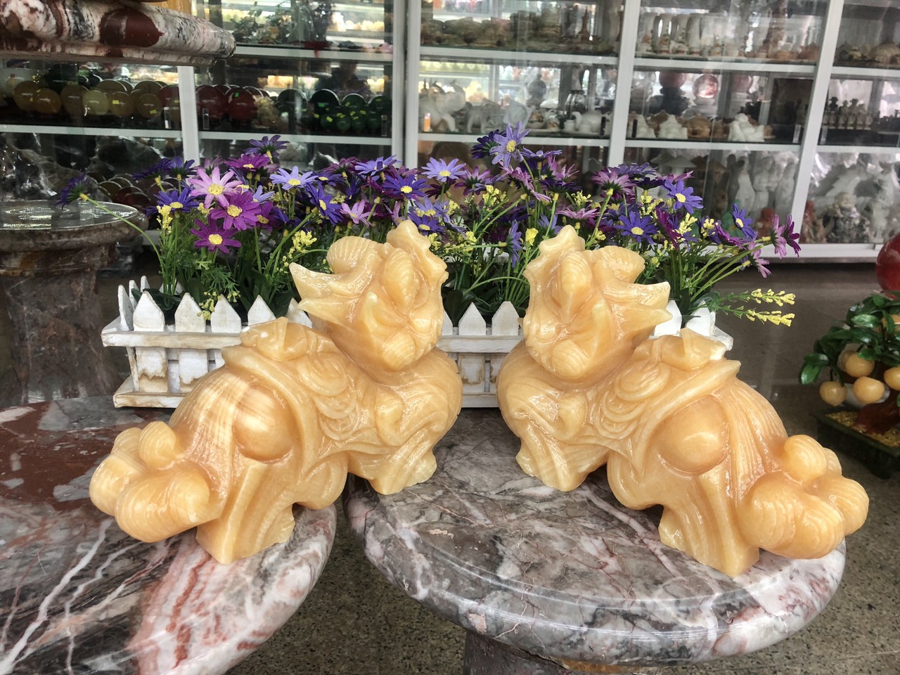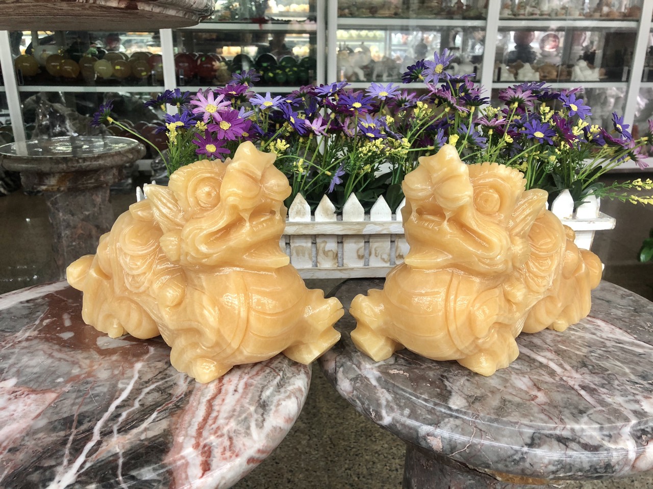 Hợp mệnh Thổ - Kim Chất liệu: Đá cẩm thạch vàng cà rốt Kích thước: Dài 15 cm X Rộng 6 cm x Cao 12,5 cm Khối lượng: 3,2 kg / cặp Ý nghĩa Tỳ