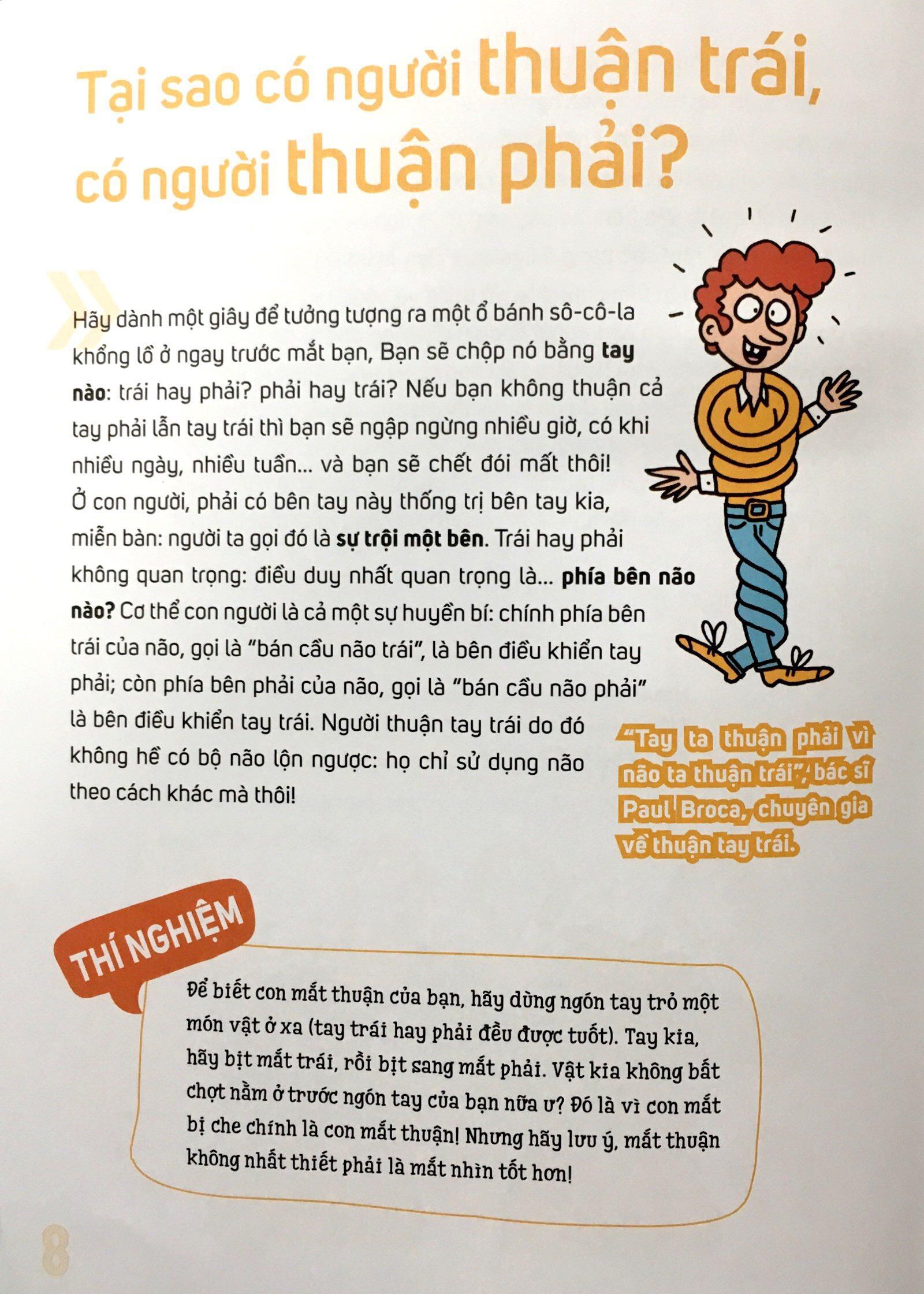 Mua tại TiktokCâu Hỏi To – Câu Hỏi Bé: Nỗi Niềm Tay Trái? Khui đồ hộp thì y như rằng… phải băng bó! Gọt viết chì thì mất cả tiếng đồng hồ! Gọt vỏ táo thì đến khổ đến sở vì lưỡi dao không bao giờ ở đúng bên! Nhưng đọc ngược bảng chữ cái thì… chuyện nhỏ! Nó dễ đến mức thầy giáo tiểu học cứ tưởng tôi nhạo thầy khi xung phong xin đọc. "Em đọc ngược rồi!" Thế là tôi bị phạt ngồi chép "Cô bé quàng khăn đỏ" đến hết giờ ra chơi. Ngày hôm đó tôi mới hiểu rằng chúng tôi, những người thuận trái, có những khả năng kì diệu. Nhưng tốt nhất vẫn nên kín kẽ khi sống trong thế giới của những người thuận phải, và đây là cuốn sách giúp bạn có mọi giải đáp để vui sống trong thế giới thuận phải!