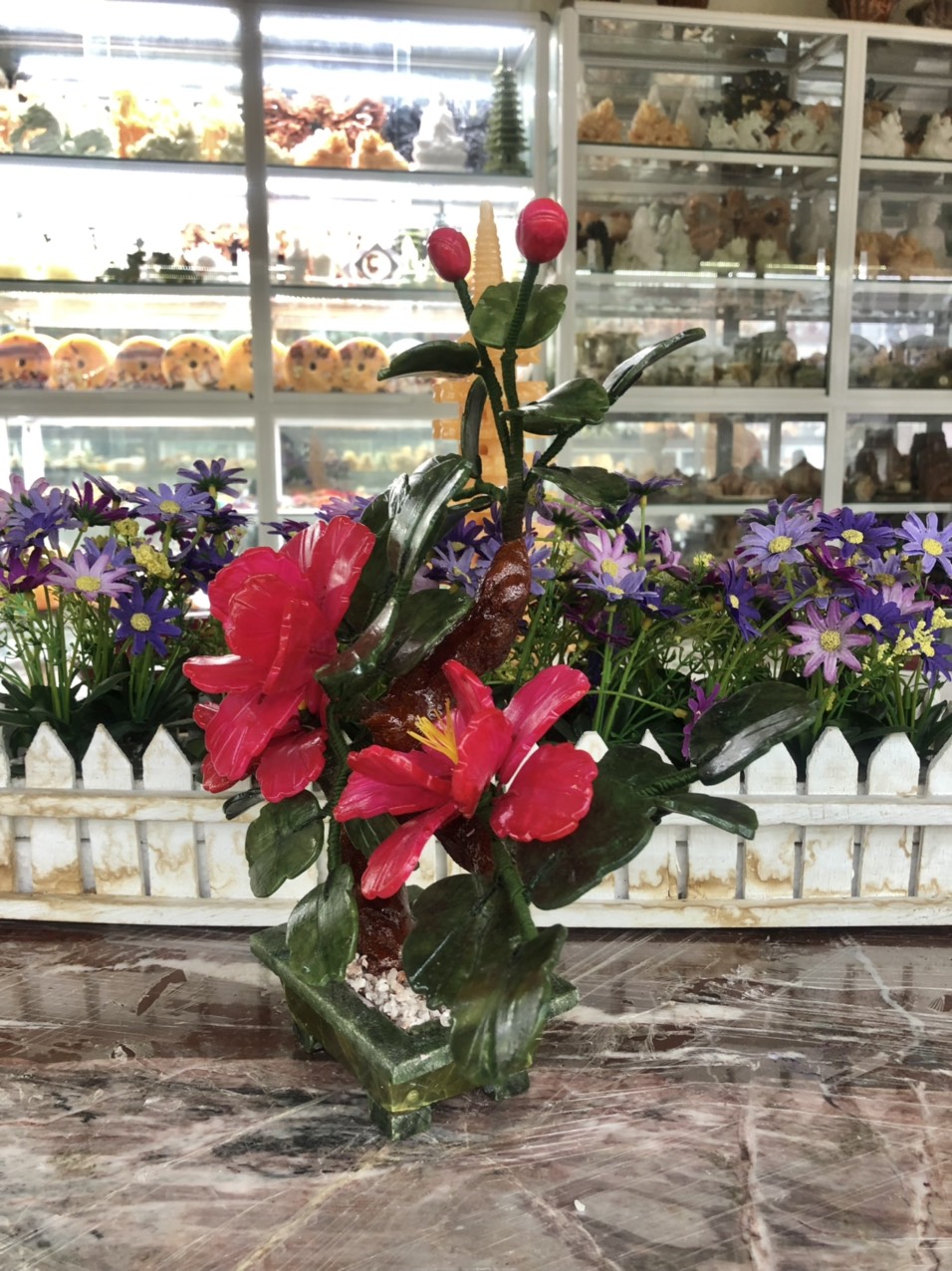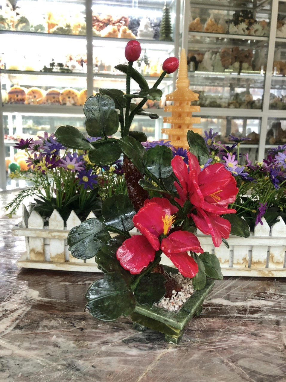Mua tại TiktokChất liệu: Hoa là đá cẩm thạch huyết; Lá và chậu là đá ngọc Ấn Độ Kích thước: Cao 30cm x Dài 27 cm Khối lượng: 1,06 kg Mỗi cây gồm 3 bông hoa
