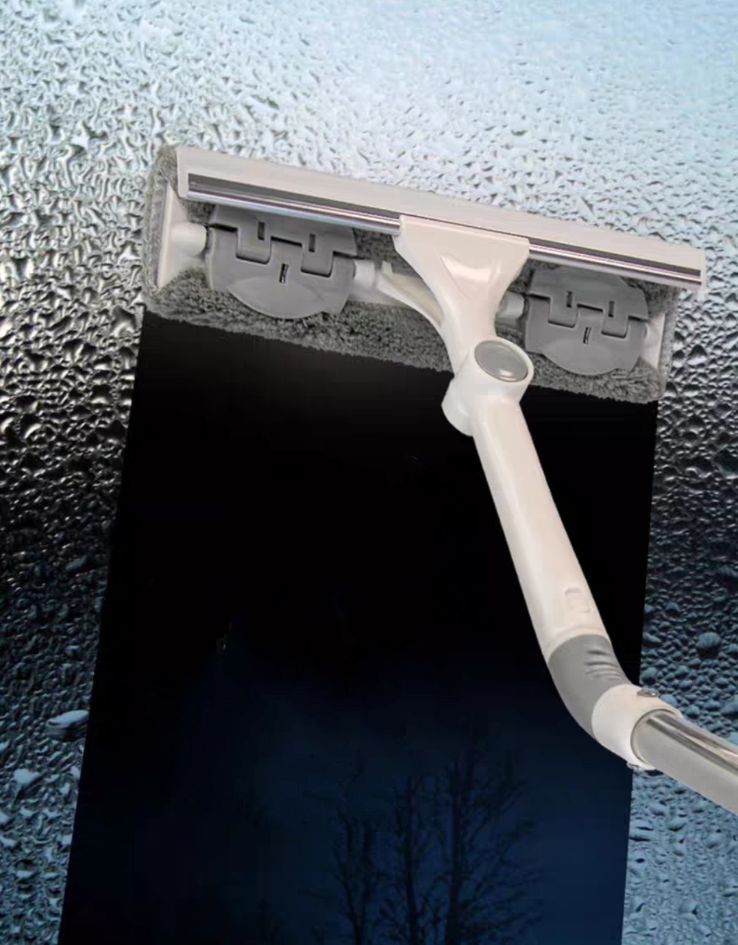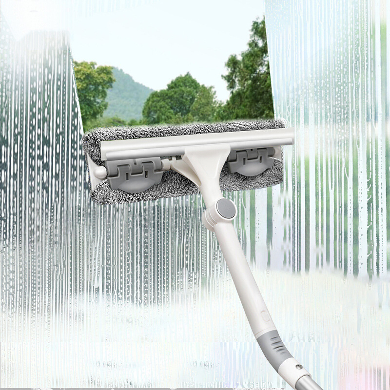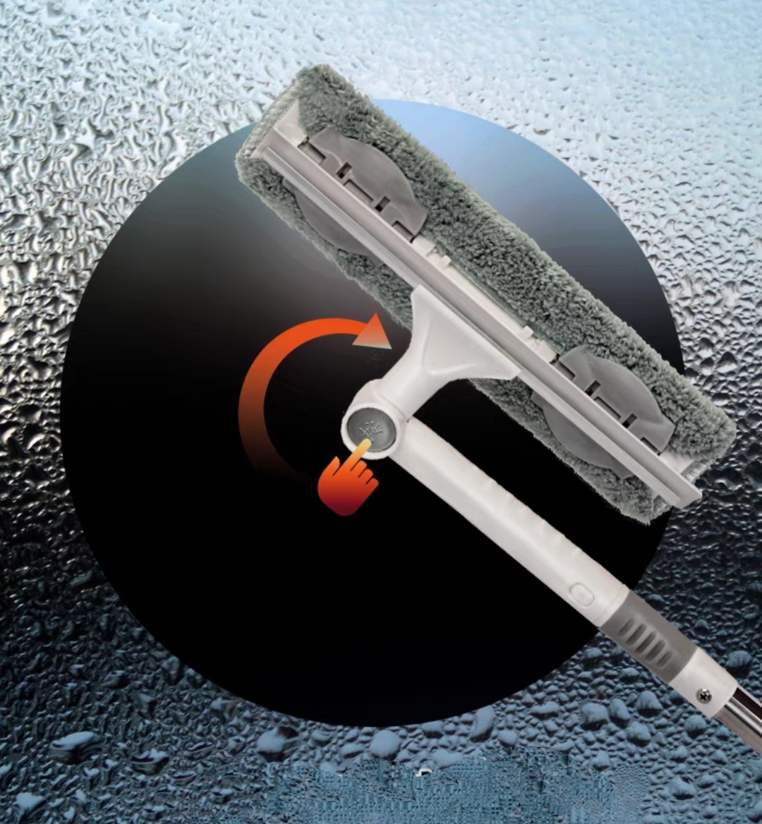 Cây lau kính thông minh 2 mặt gạt nước và lau chùi, có đầu xịt dung dịch tẩy rửa.