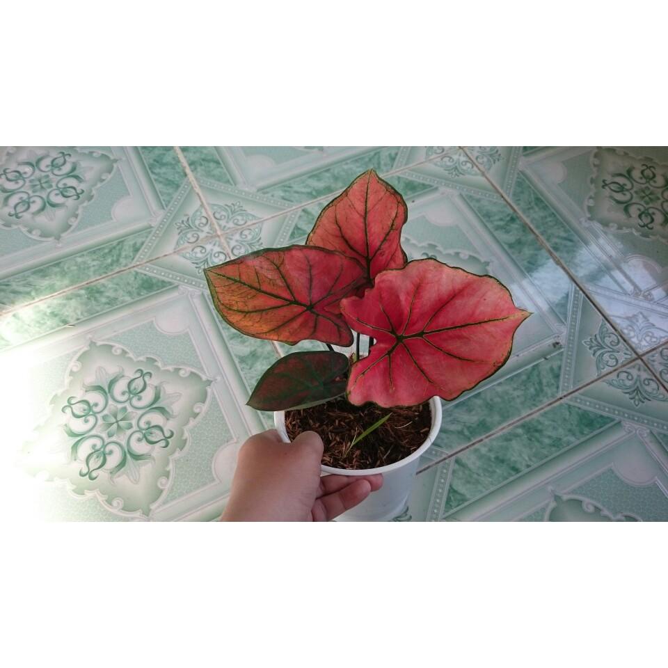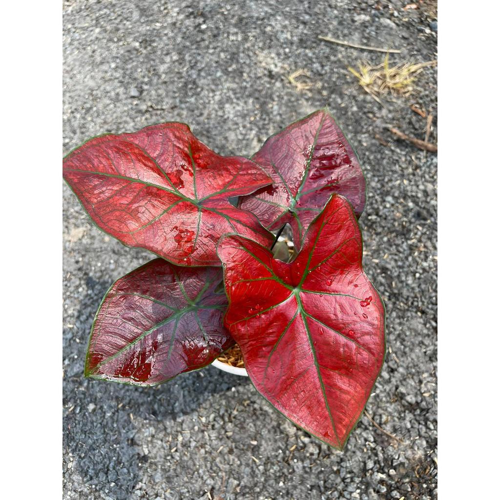 Điểm nổi bật nhất ở cây môn này là hình dáng lá độc đáo. Với những chiếc lá hình tim, nổi bật lên bề mặt lá là những đường gân và lá có màu đỏ rực rỡ, độc đáo.