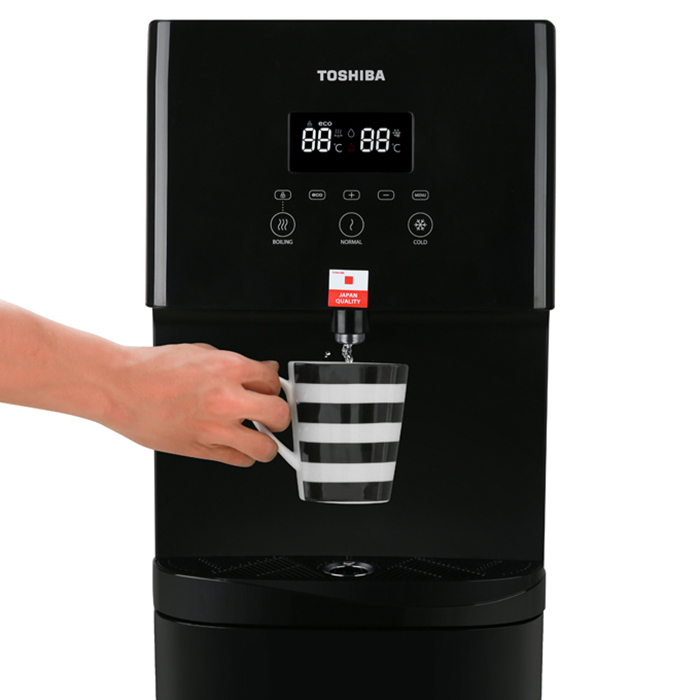Cây nước nóng lạnh Toshiba màu đen sang trọng, thiết kế hài hòa với các không gian hiện đại, tạo điểm nhấn cho không gian dùng Sản phẩm với bình chứa nước bằng chất liệu inox