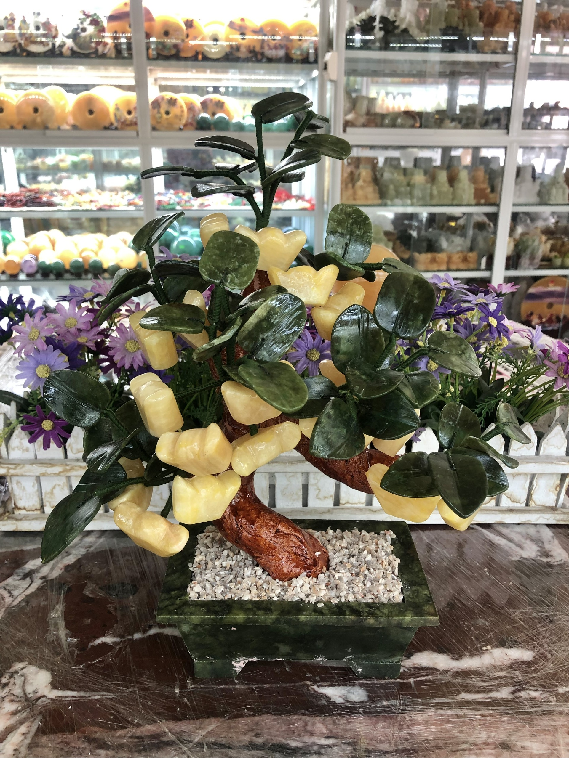 Chất liệu: Trái thỏi vàng bằng đá thạch anh vàng; Lá và Đế bằng đá ngọc Ấn Độ Kích thước: Cao 35 cm Khối lượng: 2,6 kg Bao gồm 18 trái ngân lượng Cây tài lộc là biểu tượng của sự sung túc, mang đến cát khí mạnh mẽ cho ngôi nhà, văn phòng công ty hoặc cửa hàng kinh doanh… Cây Tài Lộc bằng đá thạch anh còn có tác dụng tốt về mặt sức khỏe. Cách Sử Dụng Cây Tài Lộc Đá thạch anh: Cây Tài Lộc có tác dụng chiêu tài do vậy thường được đặt ở bên quầy thu ngân, máy đếm tiền…Có thể đặt cây tại lối đi vào các cửa hàng, cửa hiệu, phòng khách nhằm kích hoạt năng lượng cho gia chủ về tài lộc. Trưng bày trên bàn làm việc giúp trí não tinh thông. Cây Tài Lộc bằng đá thạch anh còn có tác dụng tốt về mặt sức khỏe (năng lượng dương), do đó có thể đặt cây ở bên cửa sổ ngôi nhà bạn.
