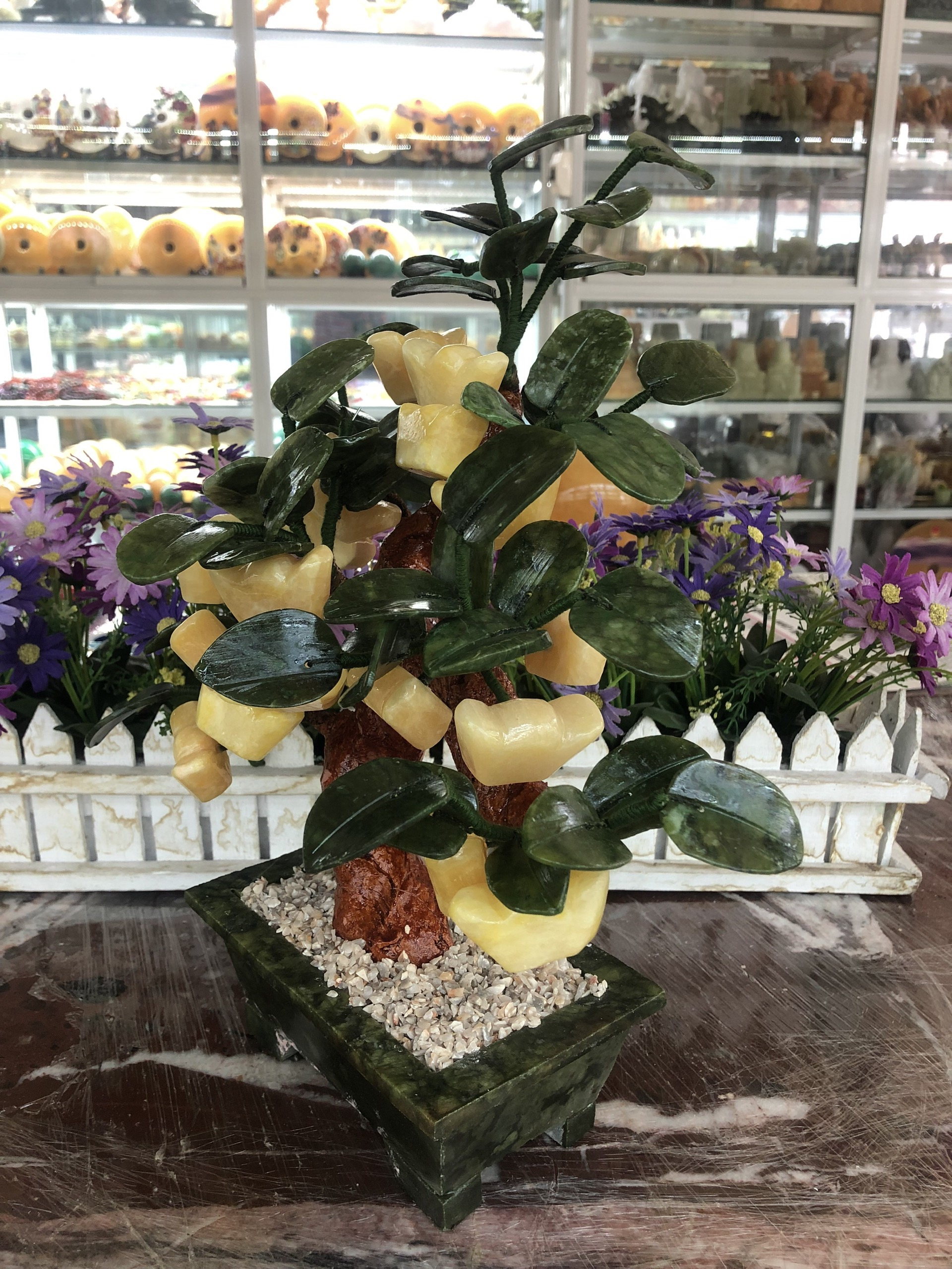 Chất liệu: Quả đào bằng đá thạch anh hồng, lá và chậu cây là đá ngọc Ấn Độ Bao gồm: 28 quả Kích thước: Cao 50 cm x Ngang 34 cm Khối lượng: 6 kg