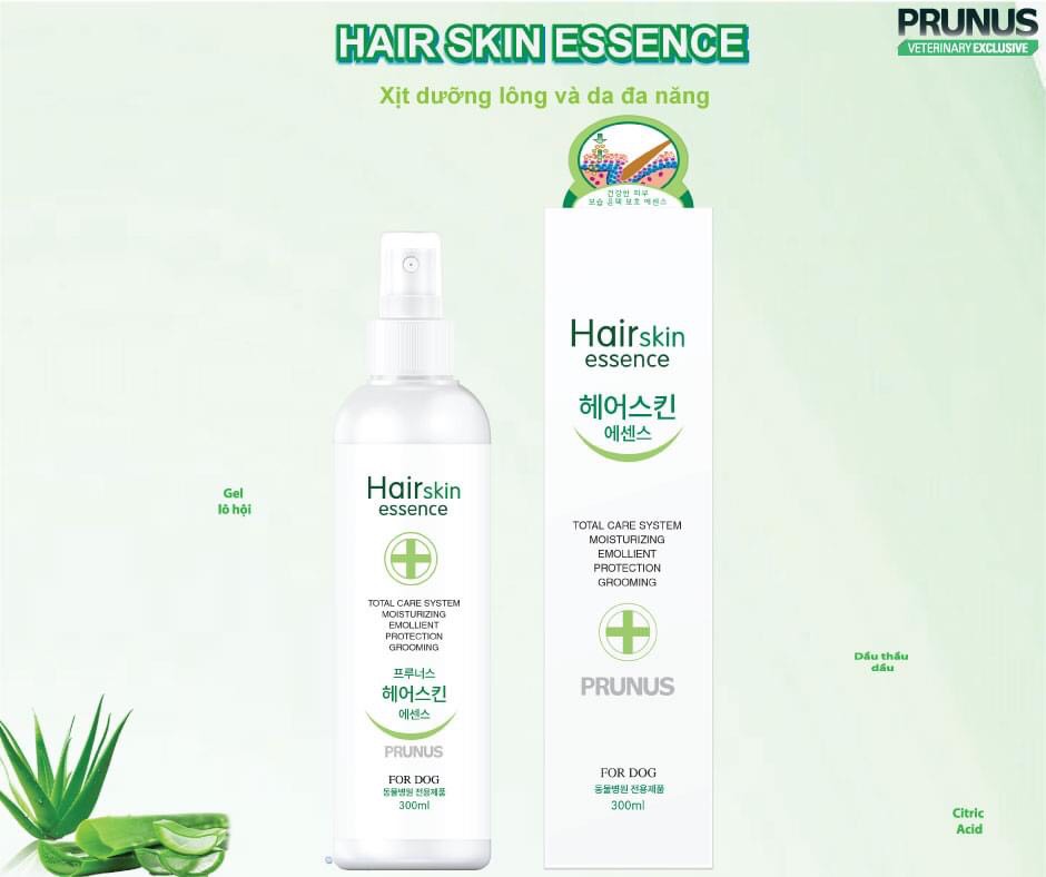 CHAI XỊT DƯỠNG LÔNG CHO CHÓ PRUNUS HAIR SKIN ESSENCE 300ML *** Làm bóng , ẩm da lông . Giảm ngứa do khô da . Ngăn ngừa lây nhiễm chéo *** Tinh Chất Dưỡng Da