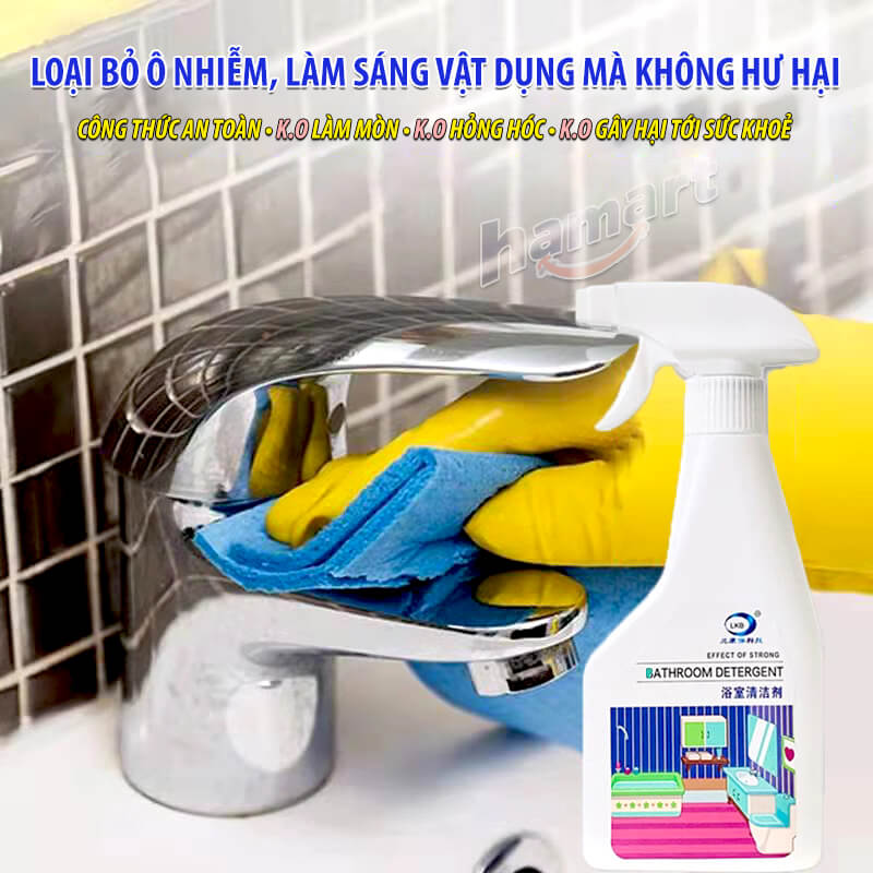 - Chuyên dụng để tẩy cặn canxi của mọi thiết bị trong nhà tắm từ vòi rửa inox, kính thuỷ tinh, bồn rửa mặt sứ, gạch men ốp tường, đá hoa lát sàn, bồn cầu, bồn tắm ...