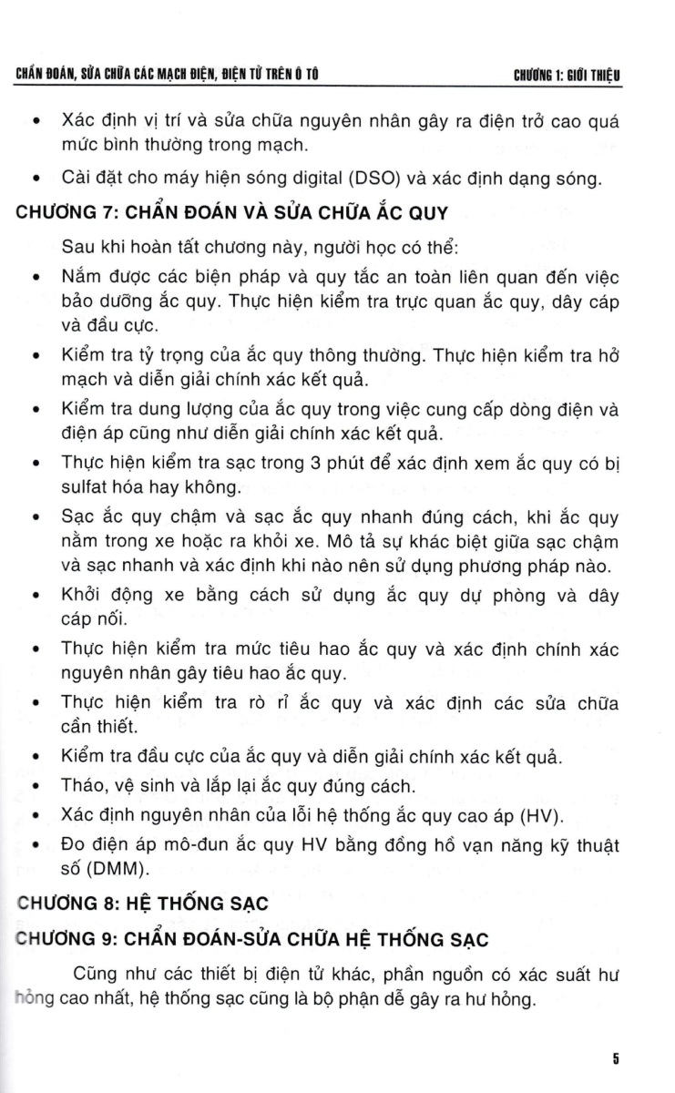 Phần 2: Gồm 4 chương (Chương 6-9) thiên về thực hành, tập trung vào các triệu chứng, chẩn đoán và thông tin sửa chữa trong thế giới thực. Nếu Chương 6 trình bày lý thuyết chung về chẩn đoán thì Chương 7, 8, 9 giới thiệu bạn đọc mạch điện tử có sác xuất hư hỏng lớn nhất trong ô tô là Ắc quy, mạch nguồn cung cấp cũng như mạch nạp.