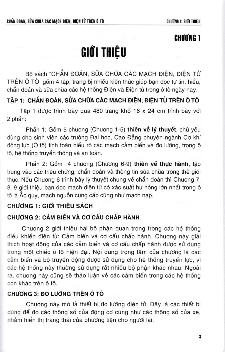 Phần 1: Gồm 5 chương (Chương 1-5) thiên về lý thuyết, chủ yếu dùng cho sinh viên các trường Đại học, Cao Đẳng chuyên ngành Cơ khí động lực (Ô tô) tính toán hiểu rõ các mạch cảm biến và đo lường và trong ô tô, hệ thống truyền thông và an toàn.