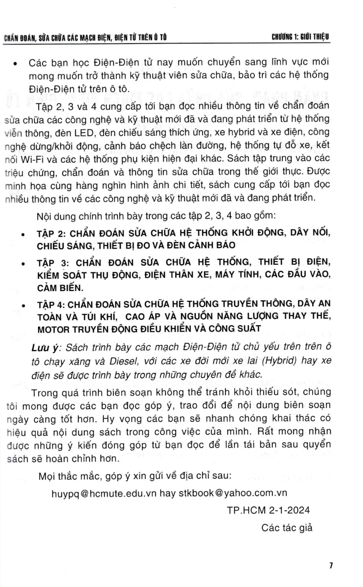 Với mong muốn phổ cập những kiến thức cơ bản về Điện - Điện tử đến với nhiều bạn mong muốn tìm hiểu hệ thống Điện - Điện tử trên ô tô. Trong các Tập 2, 3 và 4 các tác giả sẽ trình bày thiên về thực hành nhiều hơn, Người đọc có các thông tin cần thiết để bắt đầu sự nghiệp thành công với tư cách là một kỹ thuật viên ô tô nhưng nội dung trình bày vẫn hỗ trợ nhiều tron quá trình học tập ở bậc Đại học.